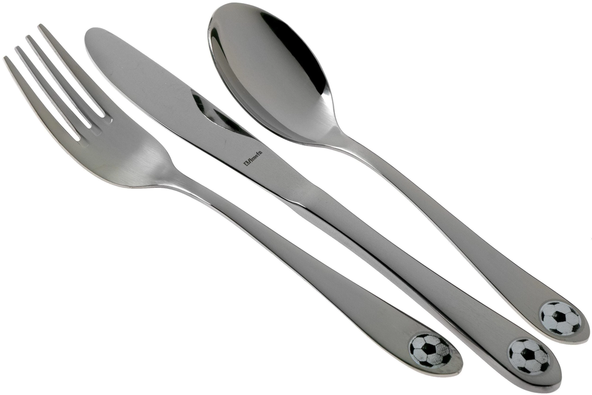 Ces couverts pour enfants ont été assemblés avec beaucoup de soin et de précision. Les parties normalement tranchantes du couteau et de la fourchette sont arrondies pour que le jeune utilisateur puisse s’en servir en toute sécurité. Chaque élément arbore un motif en lien avec le football. L’ensemble est livré dans un bel emballage cadeau coloré.