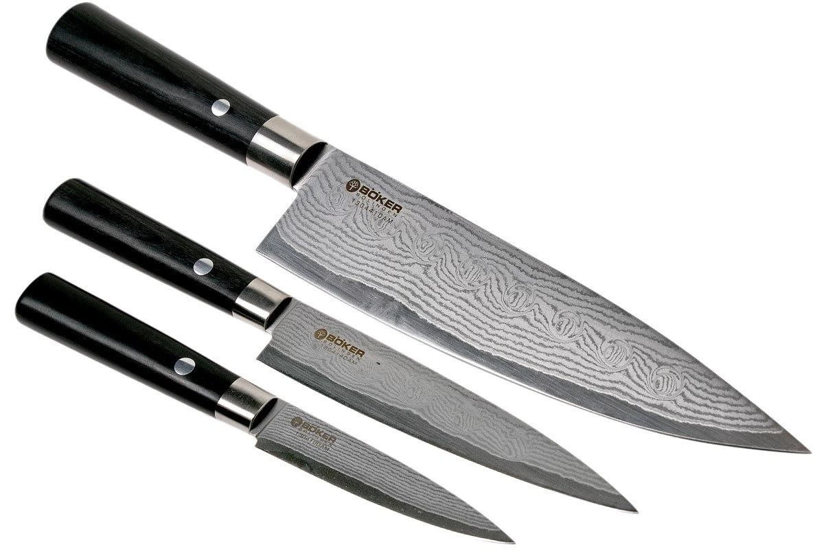 Ces couteaux de cuisine Böker Damast Black ont un manche traditionnel japonais en multiplex noir. Le design du manche avec les pinces en acier inoxydable mat apporte un aspect vraiment particulier. La couleur foncée du manche s’accorde parfaitement à la lame en acier damassé dont le noyau est en acier VG10 japonais. La lame a un tranchant incroyable pour une expérience culinaire à couper le souffle.