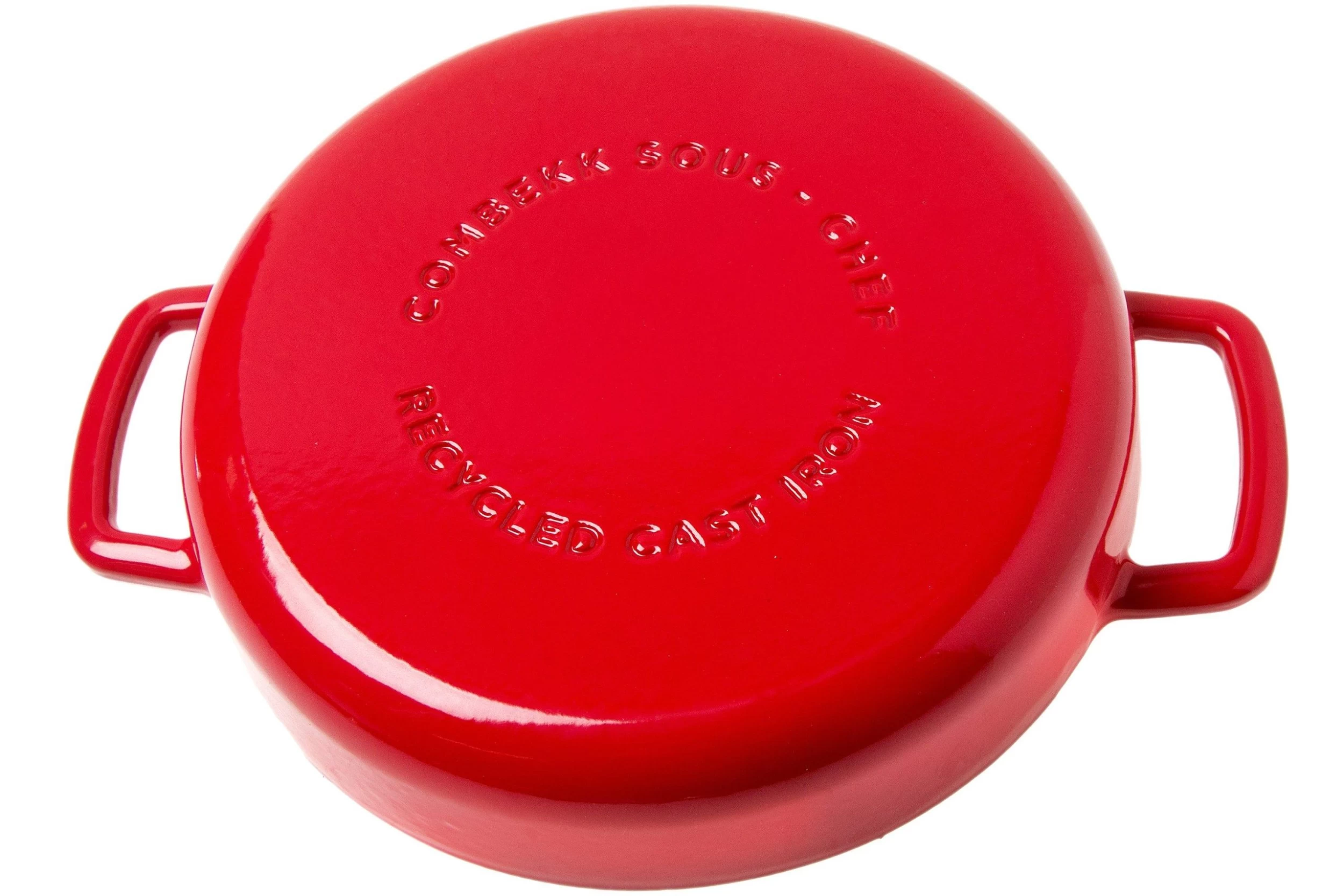 Cette cocotte rouge Combekk Sous Chef de 24 centimètres est en fonte 100% recyclée. Elle est pourvue de deux poignées, d’un revêtement émaillé, et ne contient aucun PFAS, PFOA ni PTFE.
