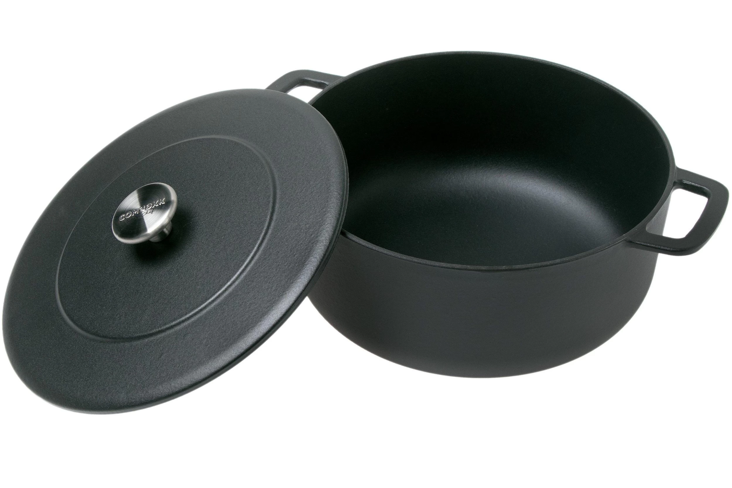 Ce Combekk Sous-Chef Dutch Oven 24 cm noir est un produit typiquement Hollandais très spécial. Une fonte de qualité, pour un design indémodable et un produit durable. Cette poêle solide en fonte vous permet de préparer toutes sortes de plats. Cuire, rôtir ou même frire : tout est possible. La fonte reste à température pendant longtemps. Que ce soit à température élevée ou basse. Cette poêle est donc également appropriée pour garder vos plats au frais dans le frigo ou dans le congélateur. Une fois la fonte refroidie, vous pouvez utiliser votre poêle pour servir vos entrées lors d’une chaude journée d’été. Le couvercle s’adapte parfaitement sur la cocotte afin de préserver les saveurs, le jus et les vitamines. La poignée du couvercle est en aluminium afin de pouvoir l’utiliser dans le four.