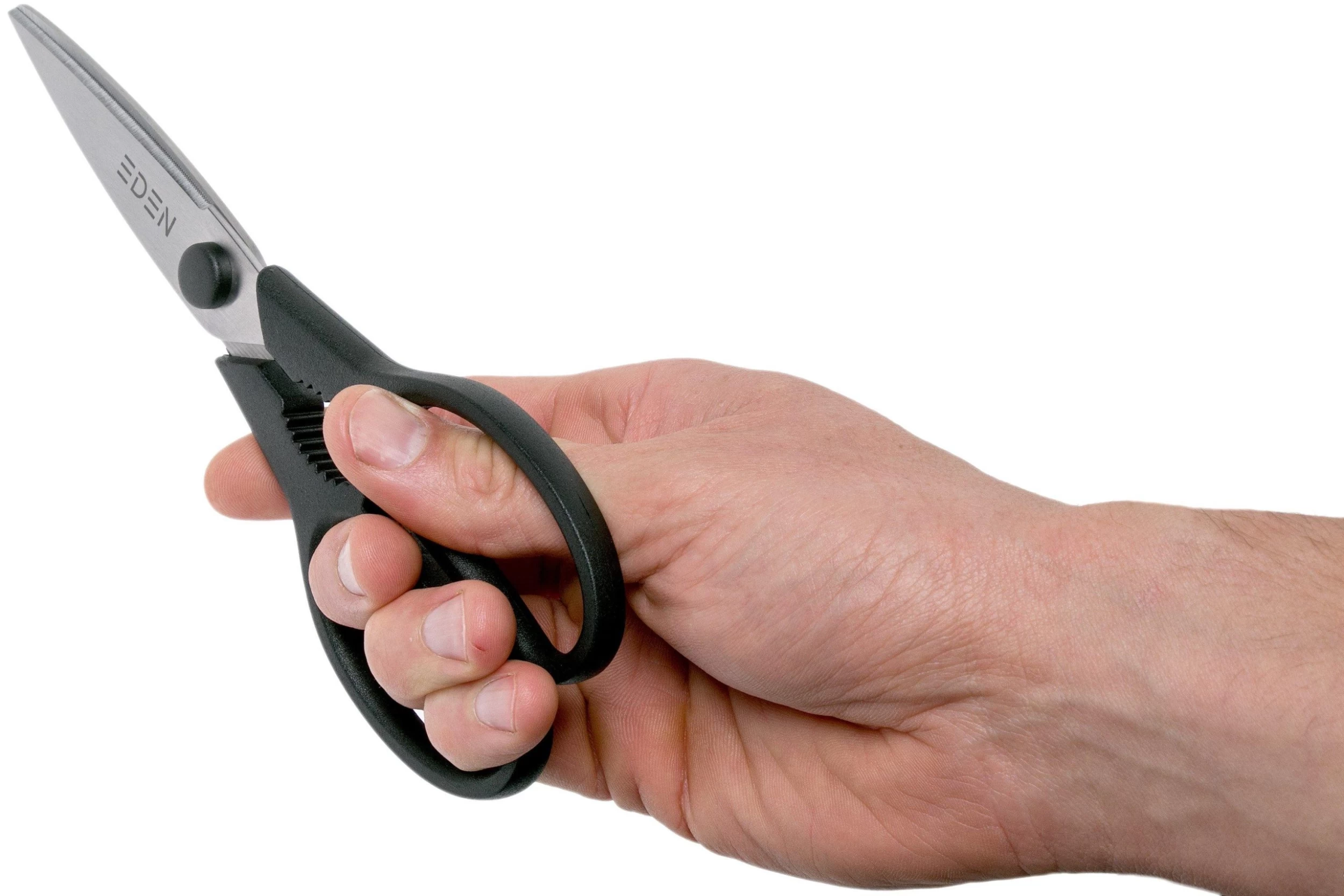 Les ciseaux de cuisine Eden Essentials conviennent à toutes sortes de tâches de cuisine. La plupart des tâches de cuisine que vous faites normalement avec un couteau sont tout aussi faciles ou même plus simples avec de bons ciseaux de cuisine. Pensez par exemple à couper des herbes et des légumes fins. Mais même le poisson et certaines viandes peuvent être coupés en morceaux avec ces ciseaux de cuisine. Les ciseaux Eden sont en acier résistant à la corrosion et les poignées en nylon. Cela vous permet de le laver dans le lave-vaisselle après utilisation. L’avantage supplémentaire est que les ciseaux peuvent être démontés. De cette façon, vous pouvez être sûr qu’il n’y a pas de restes de nourriture entre les deux.