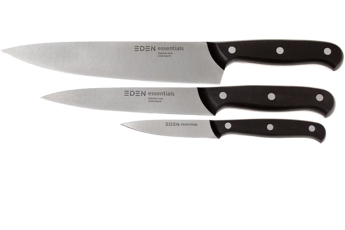 Le Couteau de chef Eden Essentials, couteau universel et couteau d’office sont le trio idéal pour presque tous les défis de pelage et de coupe. Le couteau de cuisinier comme un cheval de trait avec lequel vous pouvez réduire la taille de presque tous les produits. Le couteau universel est utilisé pour de nombreuses autres tâches pour lesquelles le couteau du chef est trop gros et le couteau d’officier prend en charge les petits travaux précis. Avec cet ensemble de couteaux vous avez tout pour effectuer toutes les tâches de coupe et d’épluchage.