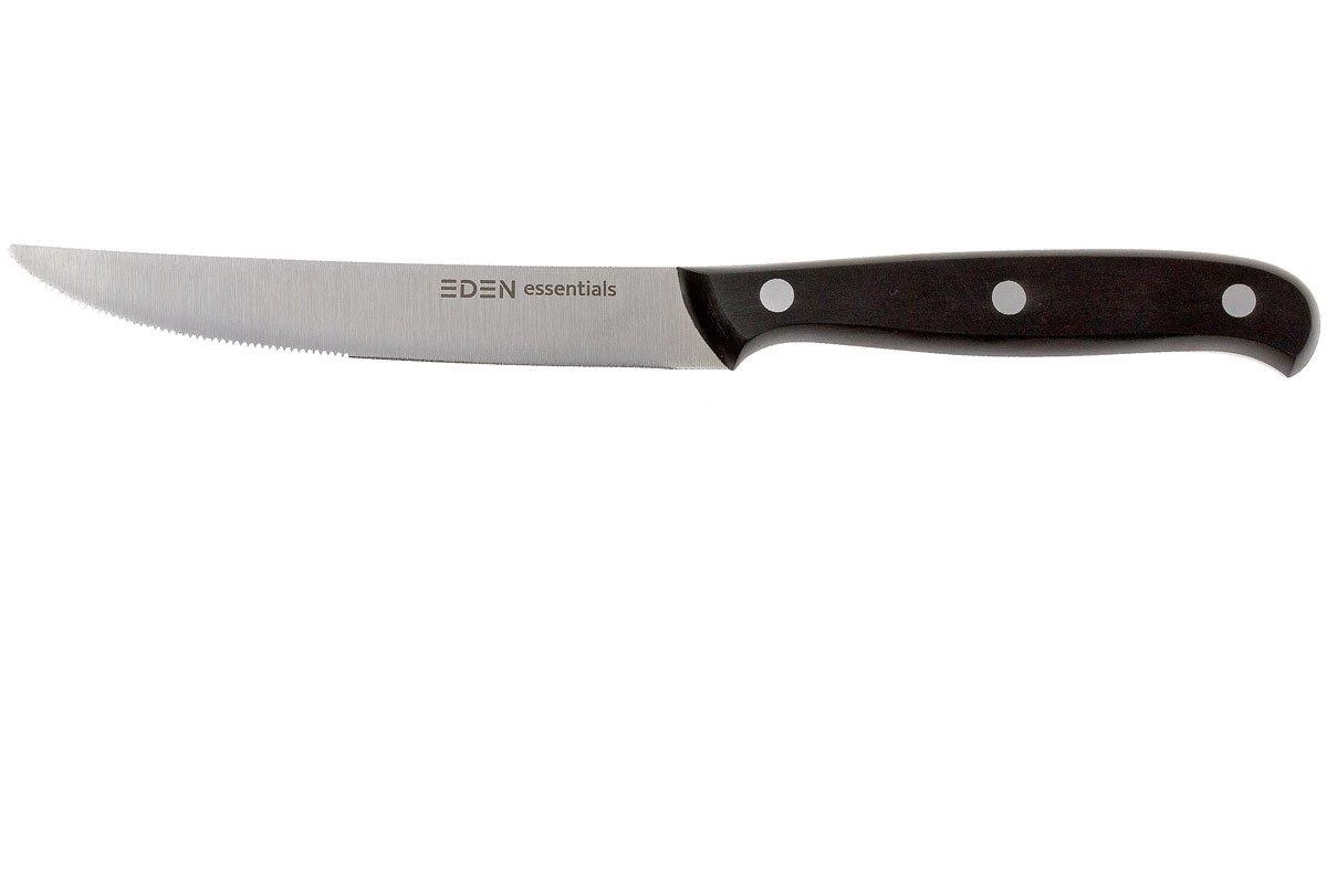 Pour couper la viande, un couteau à steak est l’outil idéal. Avec les couteaux à steak Eden Essentials couper à table est devenu un jeu d’enfant. La lame est forgée à partir d’un type d’acier dur à haute résistance à la coupe. Les lames ont une micro dentelure qui s’étend à mi-chemin à travers la lame. De plus, ces couteaux sont affûtés à un angle plus grand que les couteaux de cuisine normaux. Cette combinaison garantit que la lame reste aiguisée plus longtemps. Ils sont donc plus faciles à utiliser et à entretenir. La poignée ergonomique permet aux lames de s’allonger confortablement dans la main. En bref : ces couteaux à steak offrent des performances et une qualité élevées à un prix abordable.