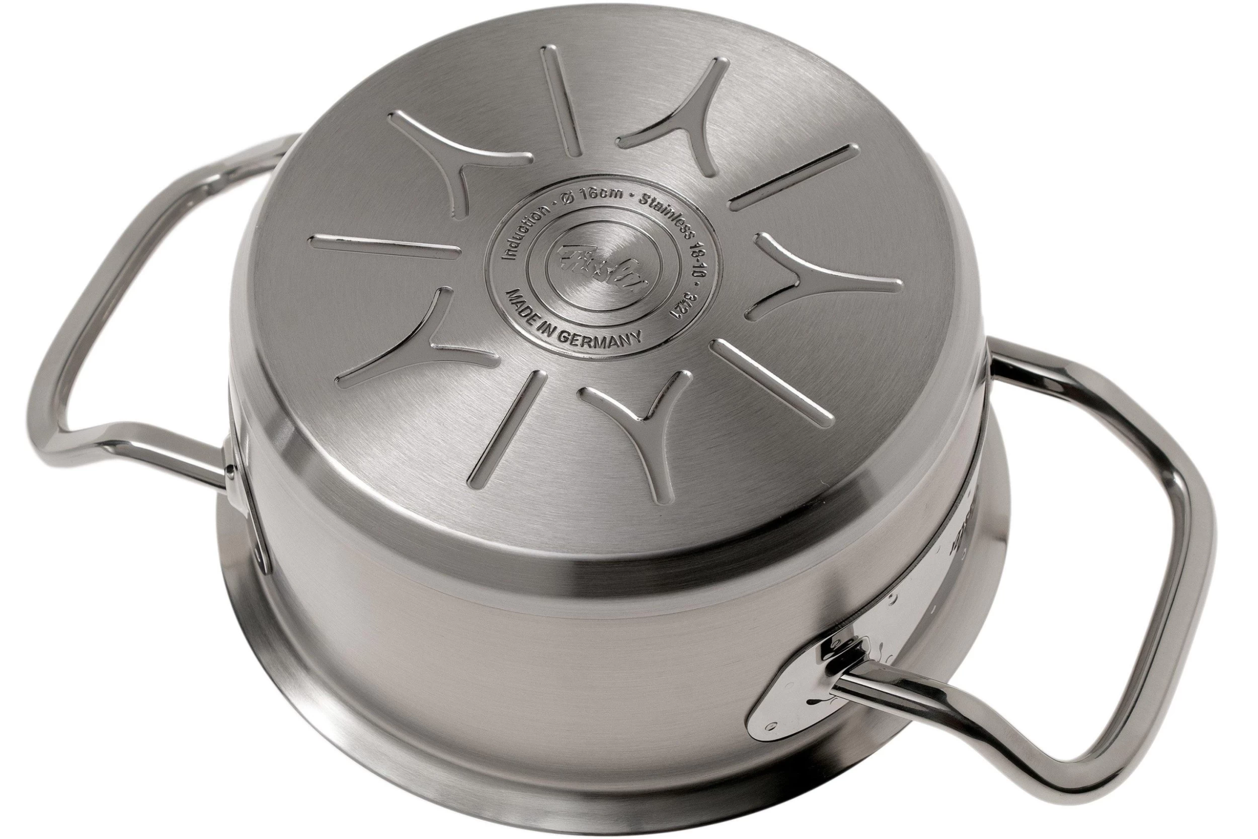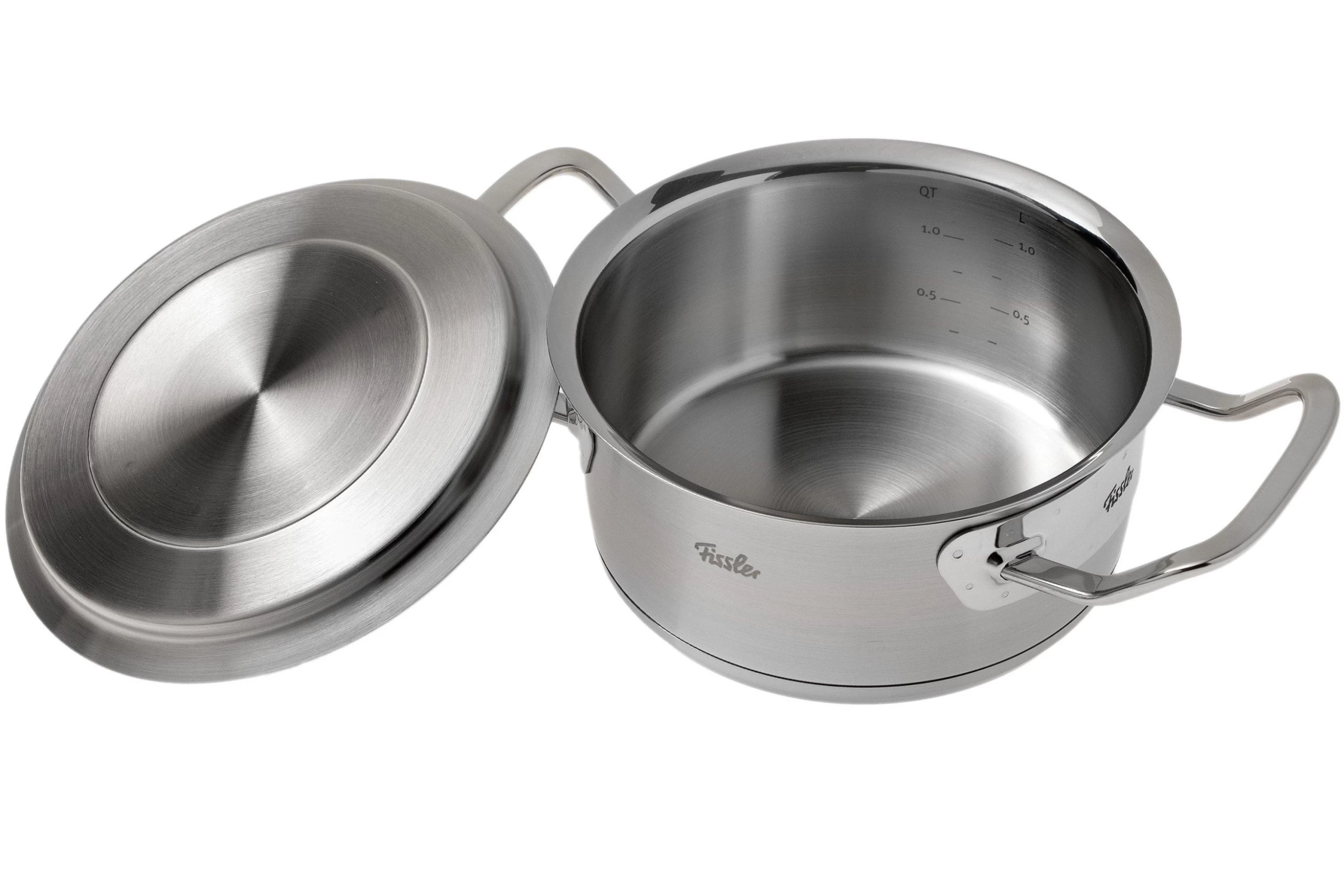 Cette sauteuse Fissler Original Profi Collection fait 16 centimètres de diamètre et peut contenir jusqu’à 1,4 litre. La graduation interne va jusqu’à 1 litre. Elle est livrée avec un couvercle en métal.