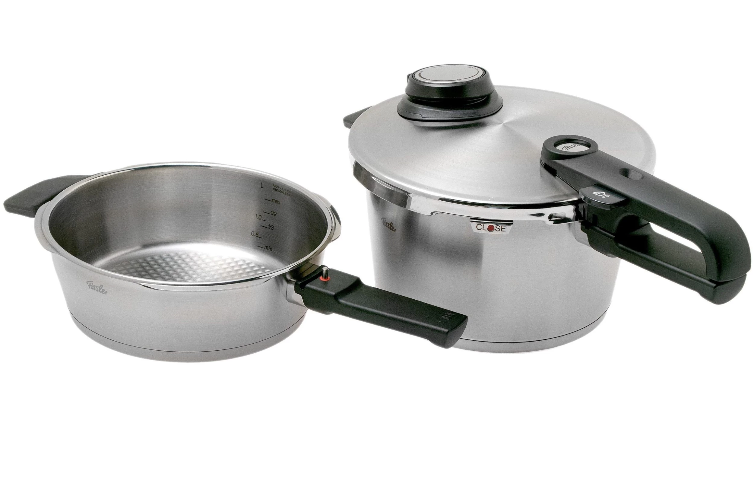 Cet autocuiseur Fissler Vitavit Premium avec graduation interne peut contenir au maximum 3 litres. Il est accompagné d’une cocotte de 2,5 L et d’un panier vapeur perforé.
