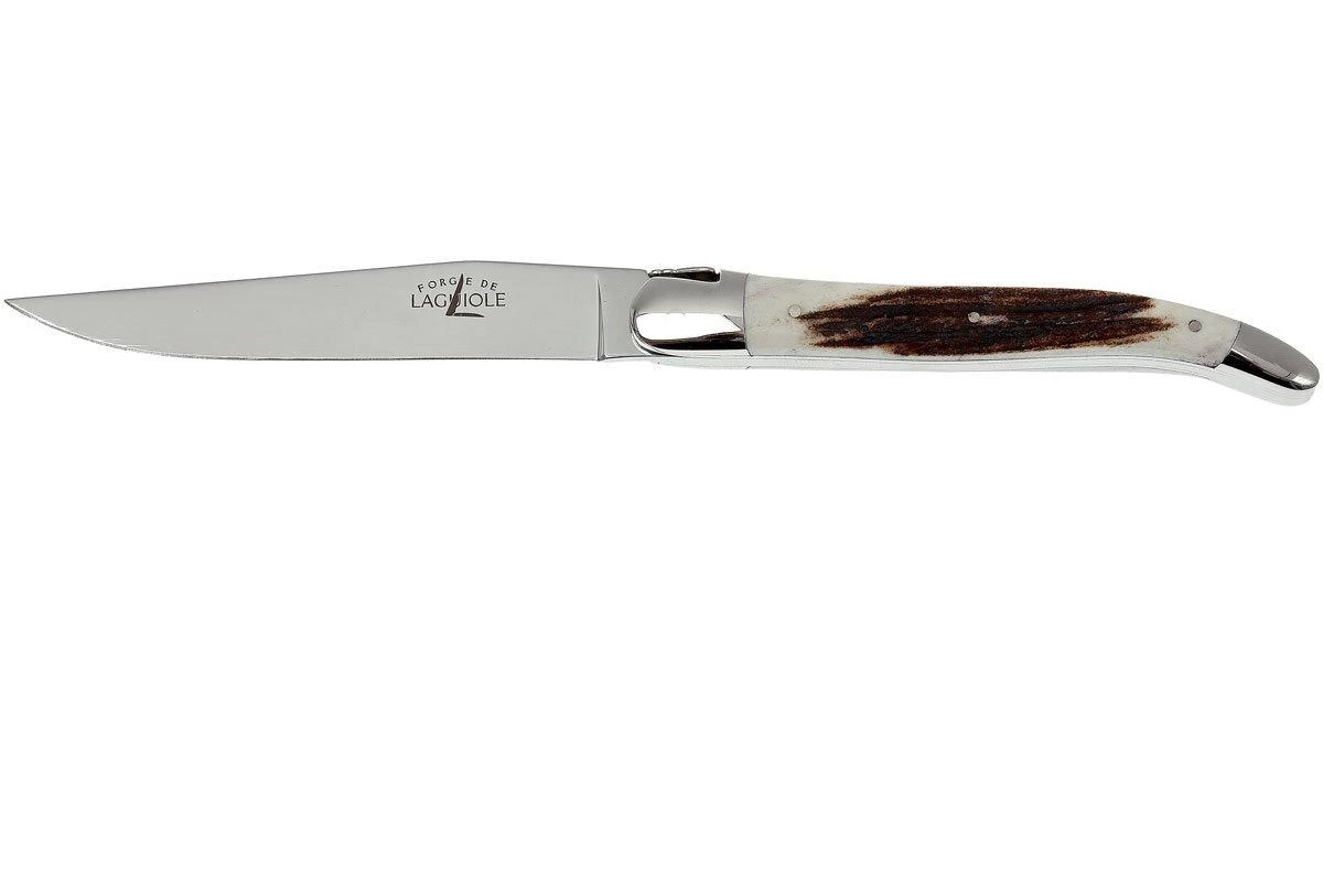 Ce set de couteaux à steak Forge de Laguiole est composé de deux magnifique couteaux fabriqués à la main. Les couteaux ont une lame en acier inoxydable très tranchante et qui conserve très bien son tranchant. Les manches en corne de cerf sont très luxueux et sont ornés de la fameuse croix du berger formée avec les sept rivets. L’abeille si caractéristique de Laguiole ne manque pas à l’appel.