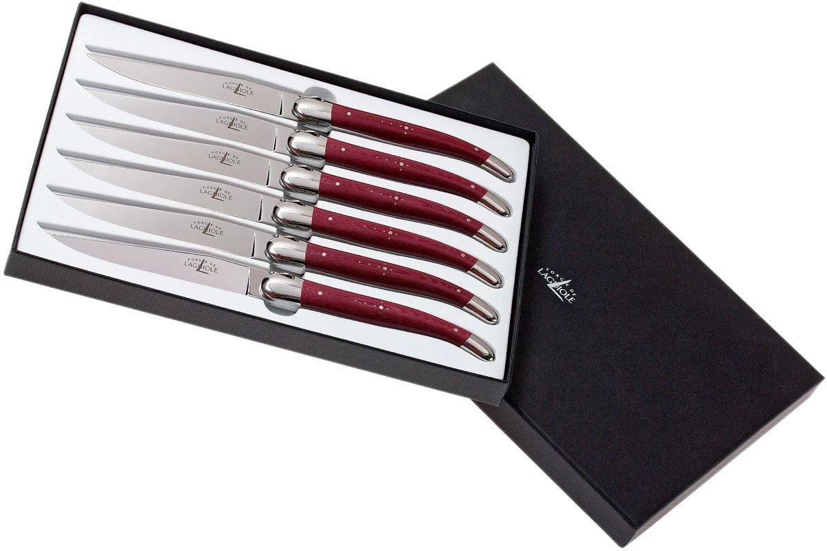 Ce set de couteaux à steak Forge de Laguiole est composé de six magnifique couteaux fabriqués à la main. Les couteaux ont une lame en acier inoxydable très tranchante et qui conserve très bien son tranchant. Les manches en micarta sont très luxueux et présente la fameuse croix de berger. L’abeille si caractéristique de Laguiole ne manque pas à l’appel.