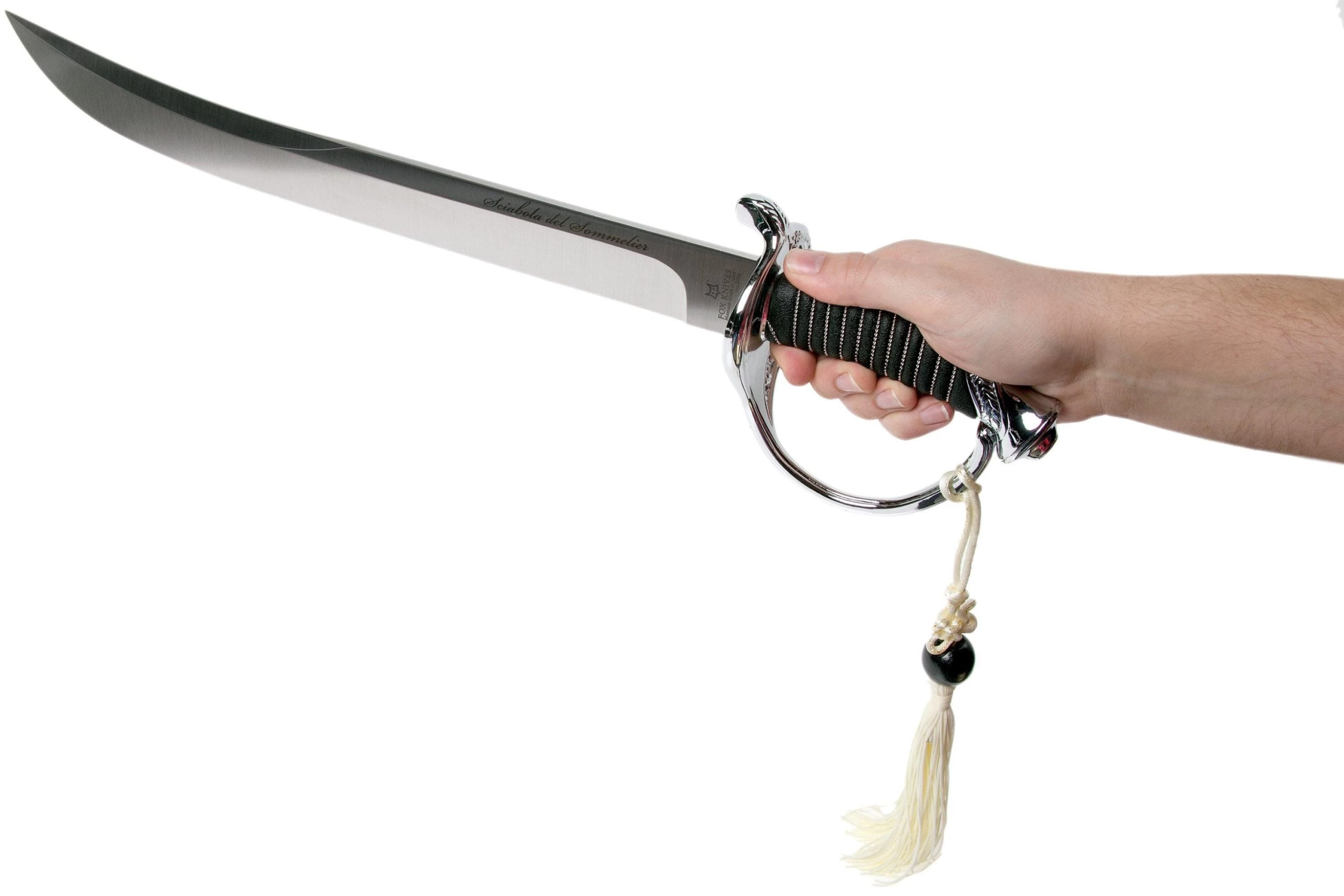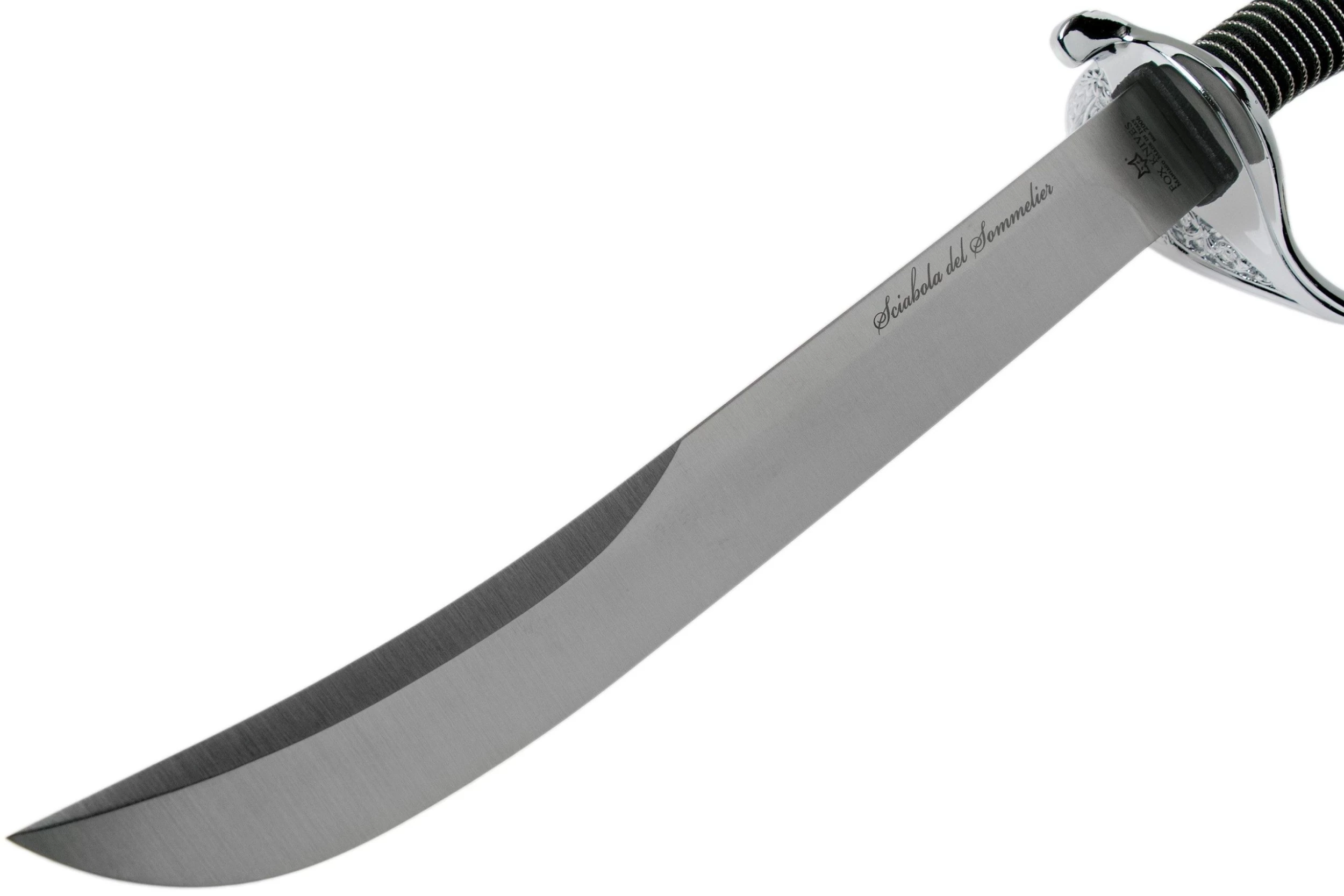 Comme toujours avec cette marque, ce sabre à champagne Fox de haute qualité est fabriqué à la main en Italie dans les ateliers de Maniago. Ce sabre respire le luxe. Le manche est décoré avec un motif unique, les finitions en nickel sont magnifiques, tout comme la garde. Le manche est recouvert de cuir noir et pourvu d’une dragonne blanche. La lame est en acier inoxydable T5MoV. Ce sabre est livré dans un coffret de rangement luxueux en bois avec un socle noir, également en bois. Il permet de présenter ostensiblement le sabre dans son coffret. A table ou accroché au mur, c’est une véritable œuvre d’art. Cet ensemble complet est un cadeau parfait pour tous les amateurs de champagne.