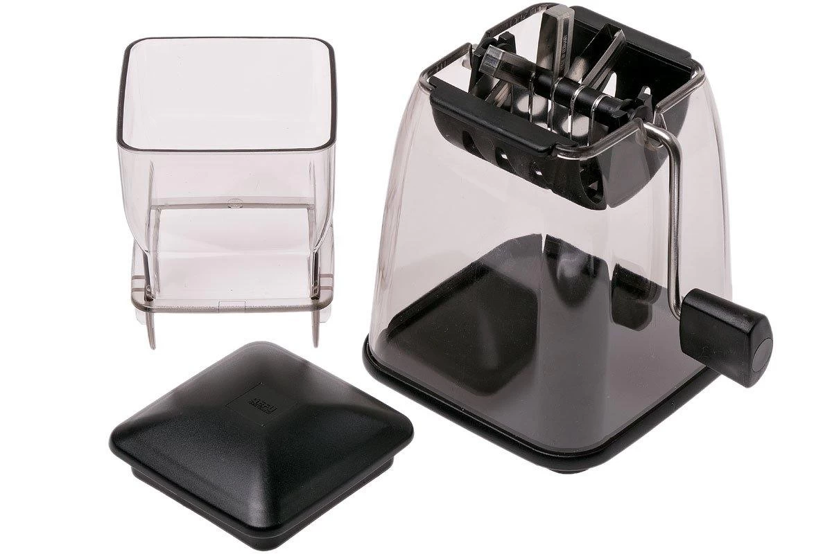 Avec le coupe-dés GEFU, découpez des cubes de légumes en un clin d’œil ! Idéal pour couper des oignons, des tomates, des poivrons ou d’autres aliments. Les légumes sont coupés parfaitement et précisément. Ils ne sont pas écrasés. C’est parfait pour un toast, une pizza ou une salade. Soyez créatif avec des cubes de légumes ! En tournant la poignée, les lames se mettent à tourner. Les blocs coupés sont réceptionnés dans le bac. Le bac peut servir de boite de conservation. Le couvercle inclus permet de la refermer. Les lames sont en acier inoxydable. Les autres éléments sont en plastique. Tous les éléments peuvent se laver à la main ou au lave-vaisselle.
