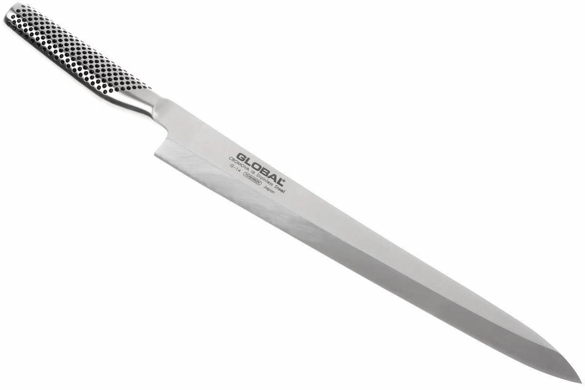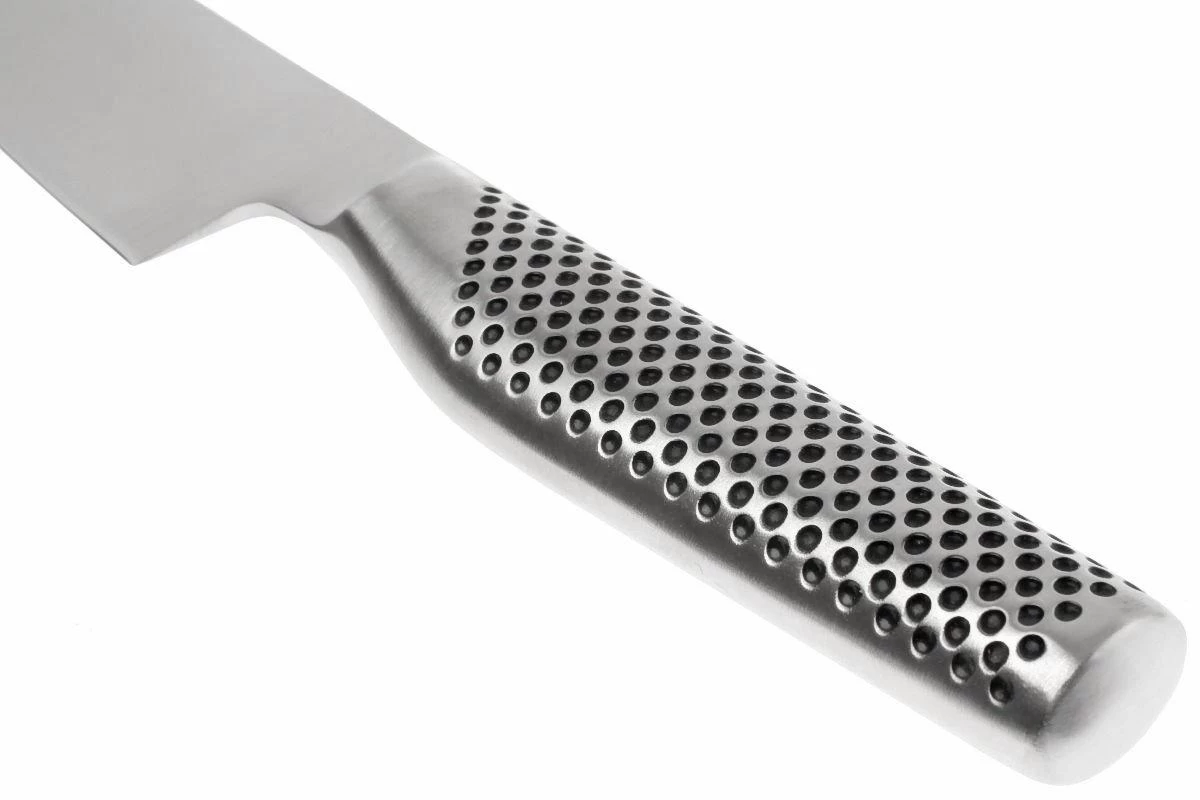 Le Global G14 est un couteau de chef multifonctionnel, qui convient uniquement aux droitiers. C’est dû à la manière spéciale de découper, qui fait que vous ne pouvez réaliser une découpe nette que si vous tenez le couteau de la main droite. La lame en acier Cromova 18 est livrée très tranchante.