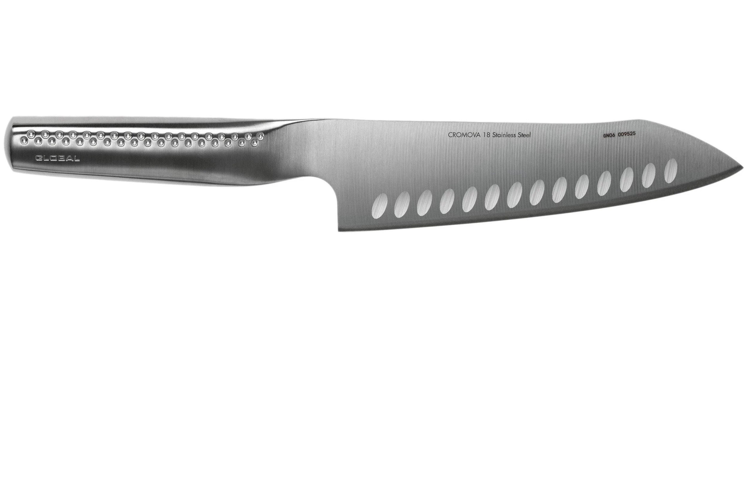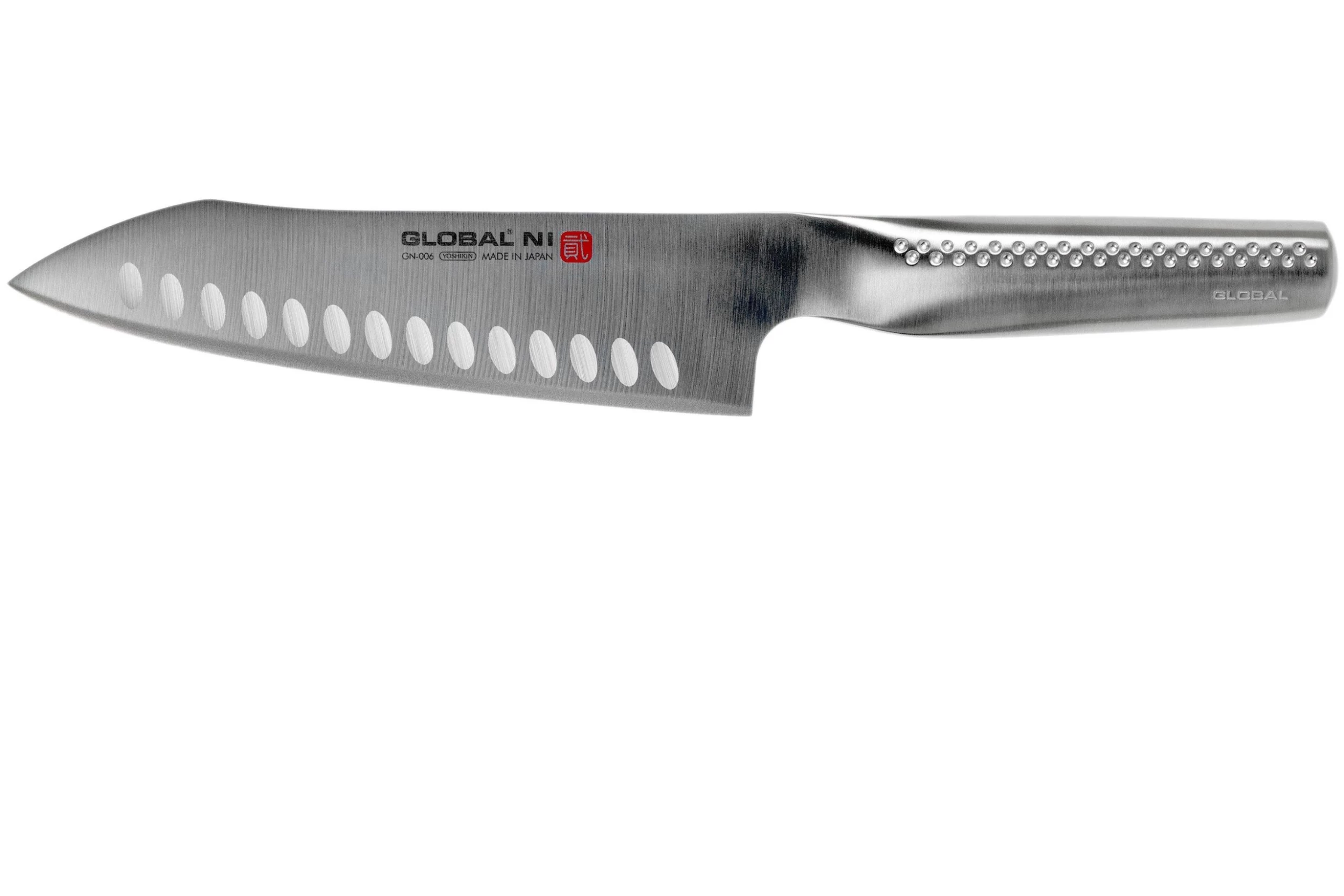Le santoku Global NI GN-006 avec alvéoles est le couteau à légumes parfait. La lame ronde est parfaite pour un mouvement fluide et les alvéoles dans la lame préviennent les aliments de coller.