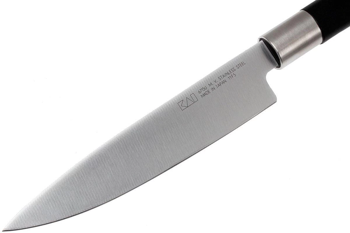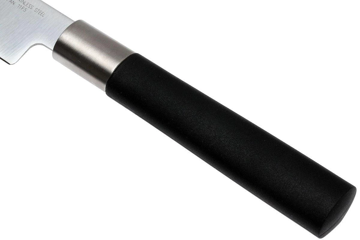 Kai est une marque de couteaux de cuisine réputée pour sa qualité exceptionnelle. La gamme Kai Wasabi permet aux cuisiniers amateurs de s’équiper de couteaux de qualité professionnelle à petits prix. La lame est en acier Daido 1K6, un type d’acier inoxydable durci à 58 HRC. L’absence de mitre vous permet d’utiliser toute la longueur du tranchant. Cela facilite grandement l’aiguisage. Le manche est composé d’un mélange de poudre de bambou et de polypropylène. Il est donc extrêmement durable et résistant à l’eau.