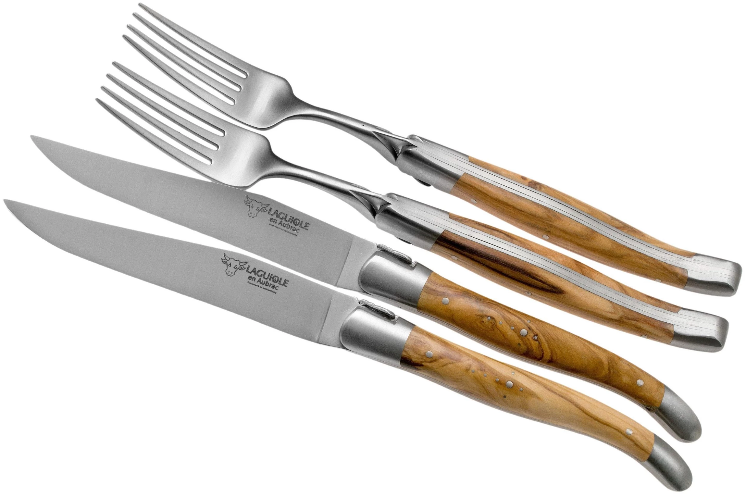 Le set de couverts en bois d’olivier Laguiole en Aubrac est un élégant set composé de 2 couteaux à steak et 2 fourchettes. Manches en bois d’olivier Cet authentique set de couverts Laguiole en Aubrac va illuminer votre table ! Ce set est livré dans son coffret en bois de chêne.
