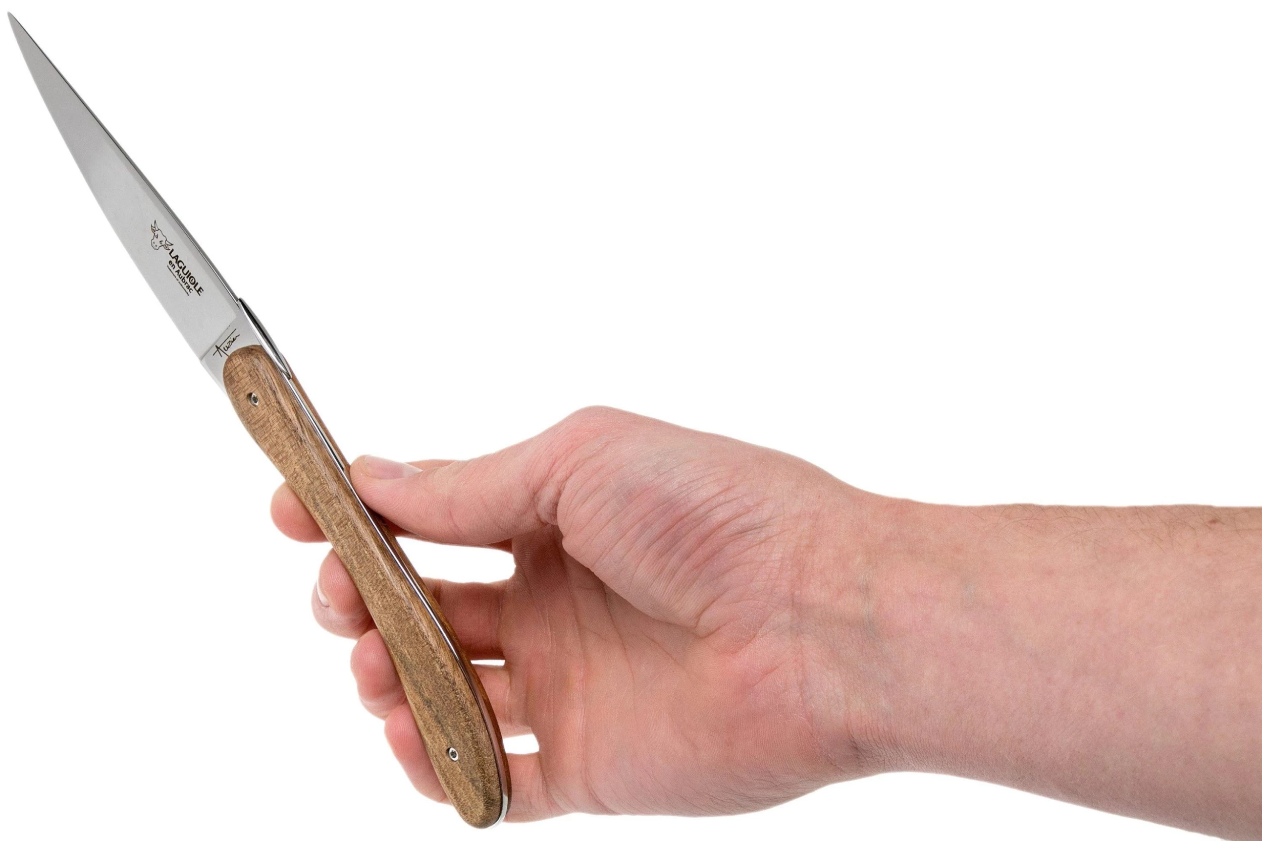 Laguiole en Aubrac est l’adresse parfaite pour des couteaux à steak français fabriqués à la main. Cette marque Laguiole authentique conçoit des couteaux hauts de gamme depuis de nombreuses années. Ces couteaux Laguiole sont faits pour être utilisés. La lame de ces couteaux de table est en acier inoxydable. Celle-ci est en full tang et se prolonge dans le manche en noyer. Car le noyer est un matériau naturel, la loupe sur chaque couteau est différente. Chaque modèle est donc unique. Ce set est livré dans une belle boîte de rangement ainsi qu’un certificat d’authenticité.