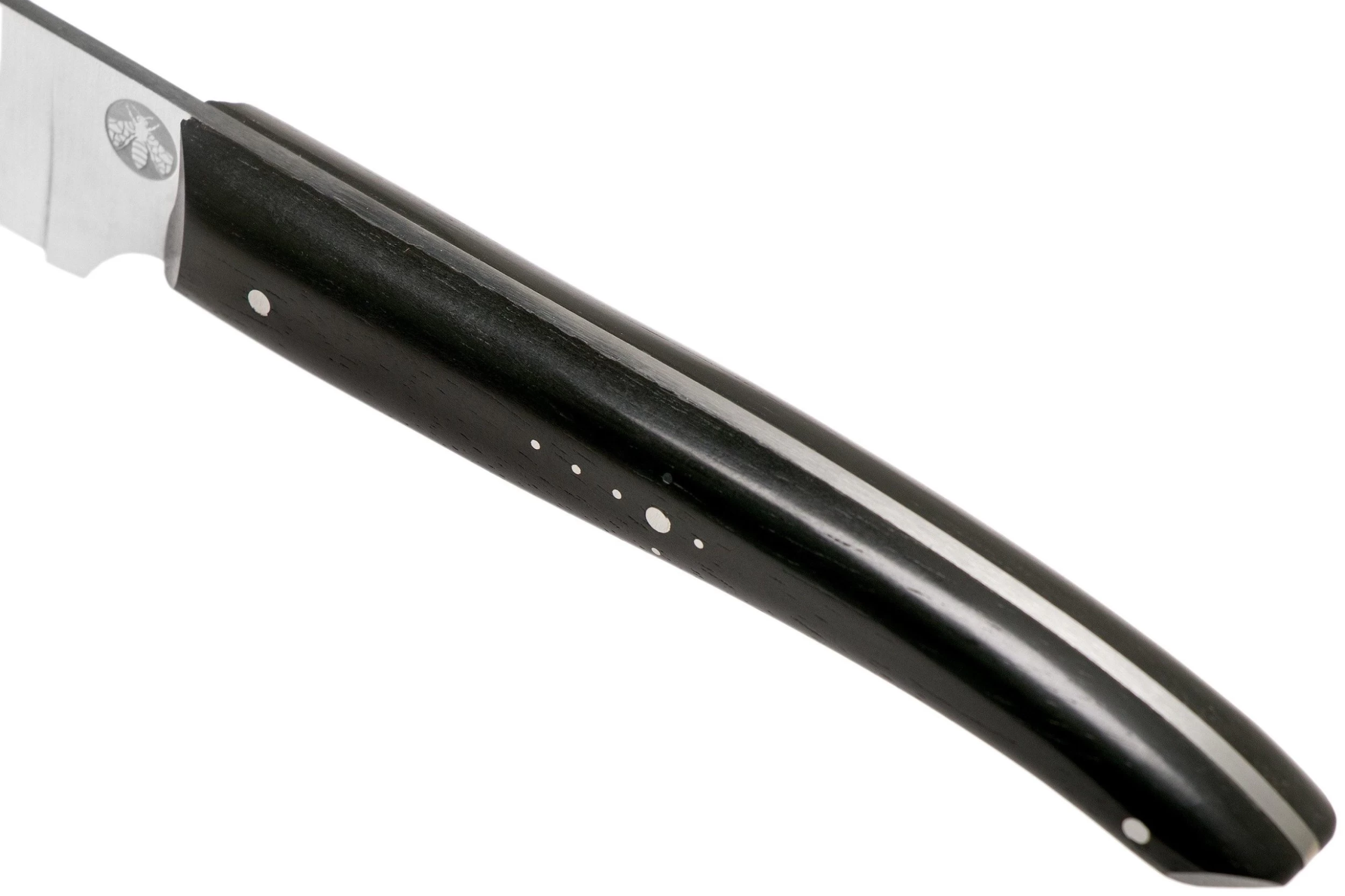 Le couteau d’office Laguiole en Aubrac Gourmet est un petit couteau d’office élégant. Ce qui saute aux yeux, c’est que le tranchant remonte directement vers la pointe. Il a ainsi une qualité de coupe excellente et une pointe très acérée. Il est parfait pour toutes les petites tâches de coupe en cuisine. Par exemple pour ouvrir des emballages, couper une gousse d’ail ou hacher des herbes. Ce couteau est fabriqué à la main à Espalion, en France.