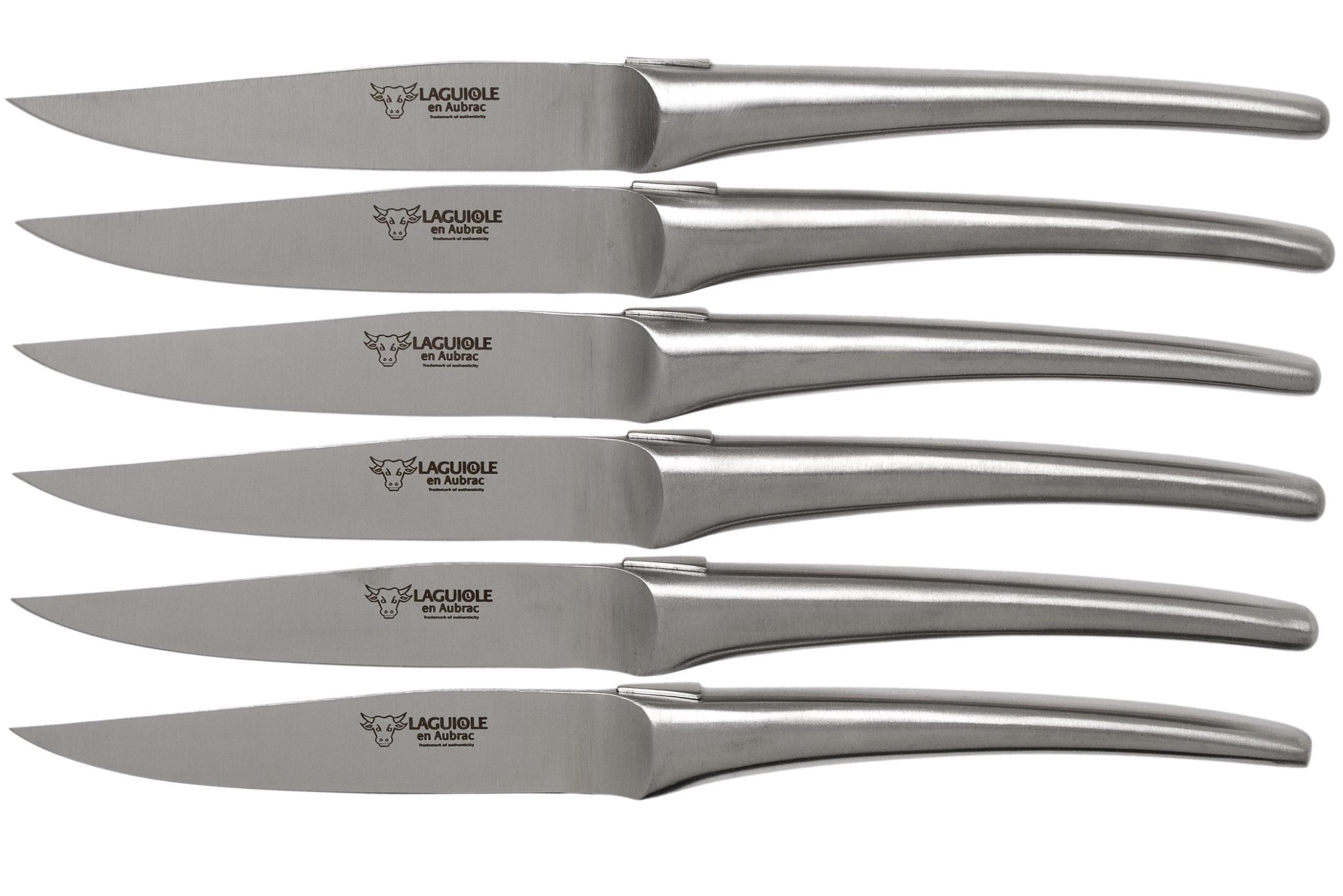 Cet ensemble de couteaux à steak Laguiole en Aubrac Monobloc se compose de six couteaux à steak minimalistes faits à la main. Le manche et la lame sont tous les deux en acier inoxydable avec finition matte. Leur composition toute en acier rend ces couteaux assez lourds. Chaque couteau pèse environ 150 grammes. On les a bien en main. Ce set de couteaux à steak Laguiole en Aubrac va illuminer votre table !