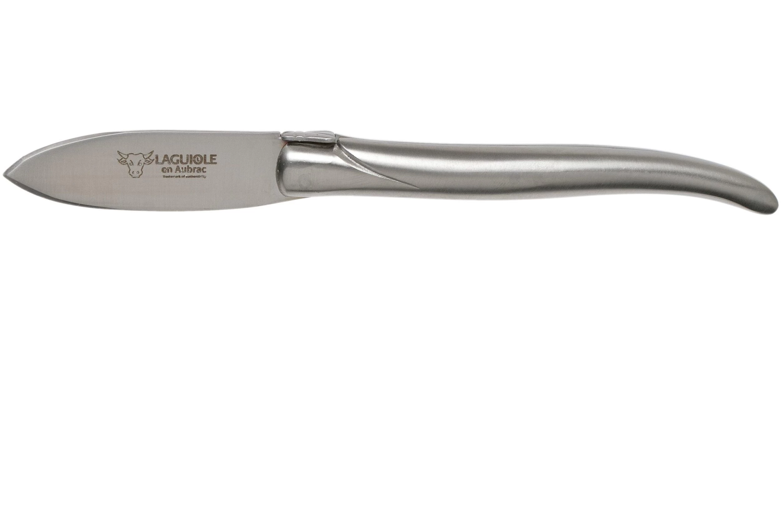 Ce couteau à huîtres Laguiole en Aubrac est un luxueux couteau bien particulier pour ouvrir en toute sécurité les huîtres et coquillages. Le manche et la lame sont tous les deux en acier inoxydable avec finition matte. Un couteau à huîtres costaud, pratique et moderne. Un superbe cadeau et un incontournable pour un festin avec des fruits de mer !