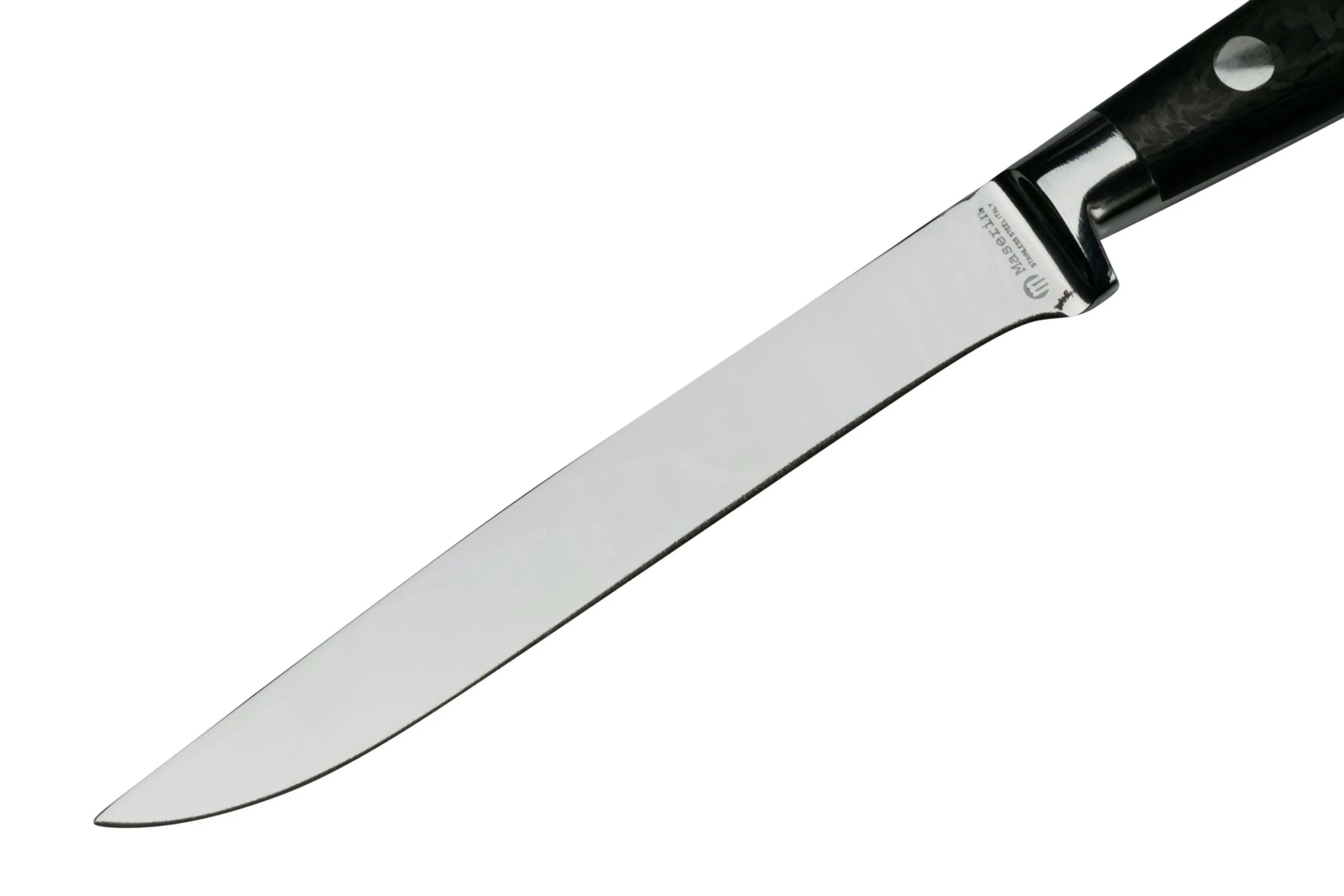 Ce set de 6 couteaux à steak Maserin Apollo Carbon est un set de couteaux élégants italiens, avec un manche en fibre de carbone. La lame de ces couteaux à steak n’est pas dentelée mais lisse et extrêmement tranchante. Cela permet de couper un morceau de viande sans la déchirer. La viande reste donc tendre et bien juteuse ! Le design mince et gracieux permet, en prime, de dresser une superbe table pour impressionner vos invités !