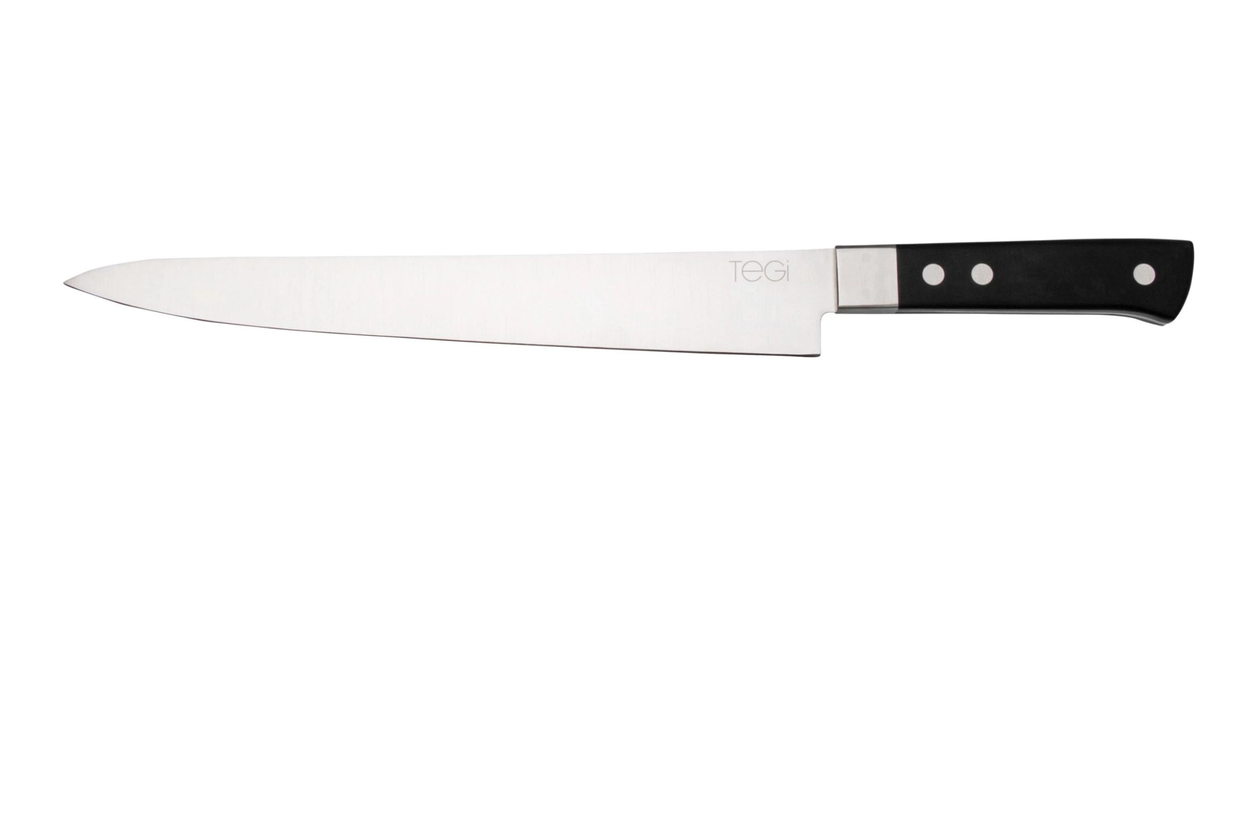 Le Sujihiki Maserin TEGI noir est un couteau allongé et très tranchant, pour la préparation de sushi et sashimi. Sa longue lame le rend parfait pour couper d’un geste la viande et le poisson en tranches extrafines et uniformes.