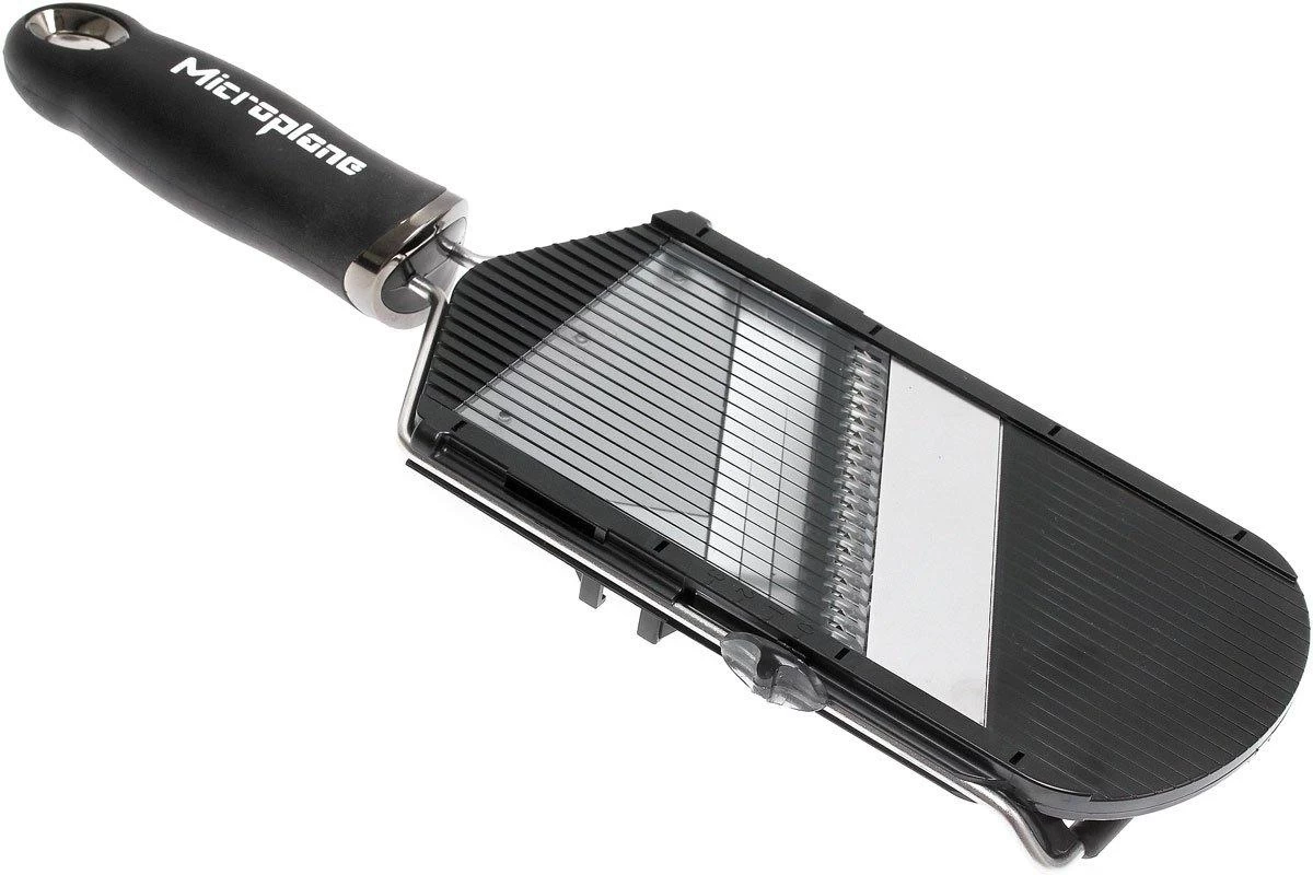 La mandoline Microplane Specialties représente une alternative compacte et avantageuse à un mandoline de grand format. Couper des tranches d’une épaisseur de 1 à 3 mm est un jeu d’enfant avec cette mandoline. On ajuste l’épaisseur facilement avec le curseur sur le bord de la lame. Le couteau à julienne permet de trancher des bâtonnets de 3 mm de largeur. On règle l’épaisseur des bâtonnets avec le même curseur que pour l’épaisseur des tranches.