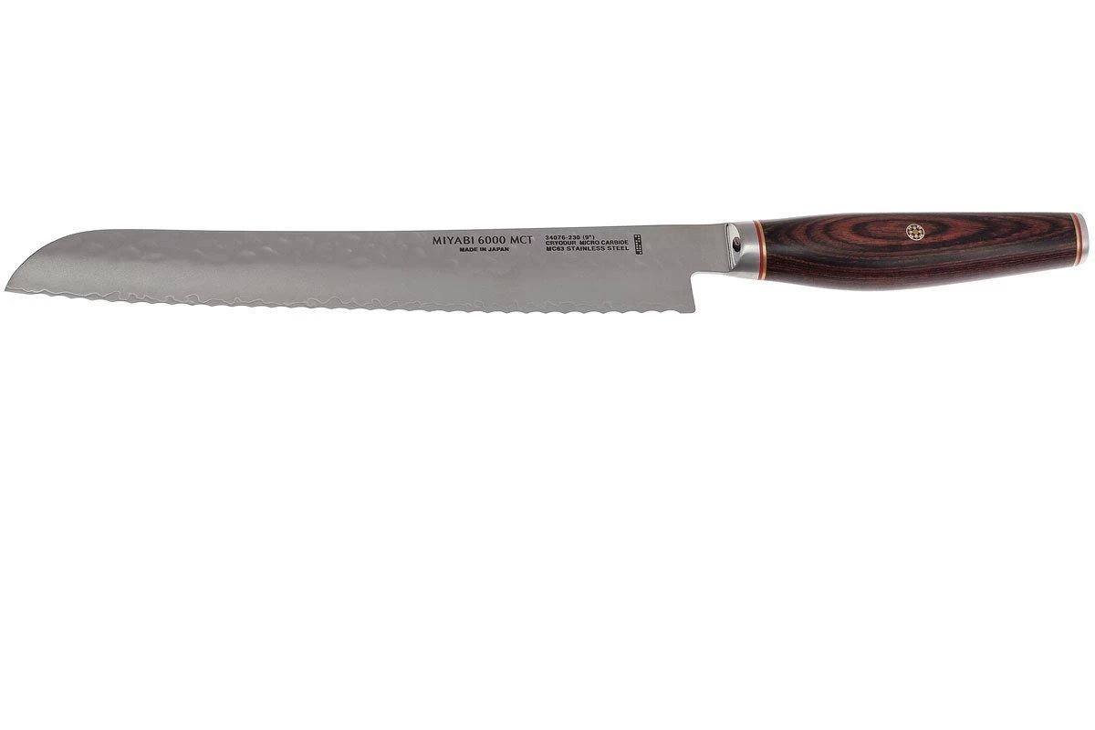 Les couteaux Miyabi 6000MCT sont aussi agréables à utiliser qu’à admirer. Le noyau de ce couteau est en acier Micro-carbure trempé dans du Cryodur d’une dureté de 63 HRC. Avec, en plus, un angle d’aiguisage très fin, ces couteaux sont incroyablement tranchants. La surface martelée à la main selon la technique appellée Tsuchime est à couper le souffle. Les cavités créées empêchent aux aliments de coller sur la lame. Le manche en bois de cocobolo stabilisé a une forme très ergonomique. Le rivet en mosaïque complète ce superbe design.