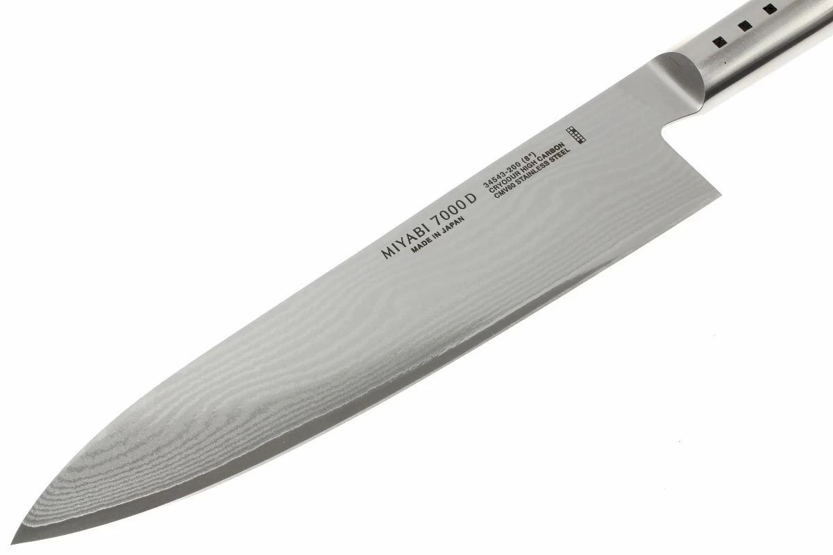 Le gyutoh de la gamme 7000D Miyabi by Zwilling est un couteau de chef qui allie propriétés de coupe inégalées et incroyable design. Des matériaux très hauts de gamme ont été utilisés pour la conception de ce couteau. Chaque couteau est aiguisé selon la technique traditionnelle japonaise qui se déroule en trois phases. L’angle d’aiguisage est incroyablement fin (moins de 10 degrés) pour un couteau des plus tranchants.