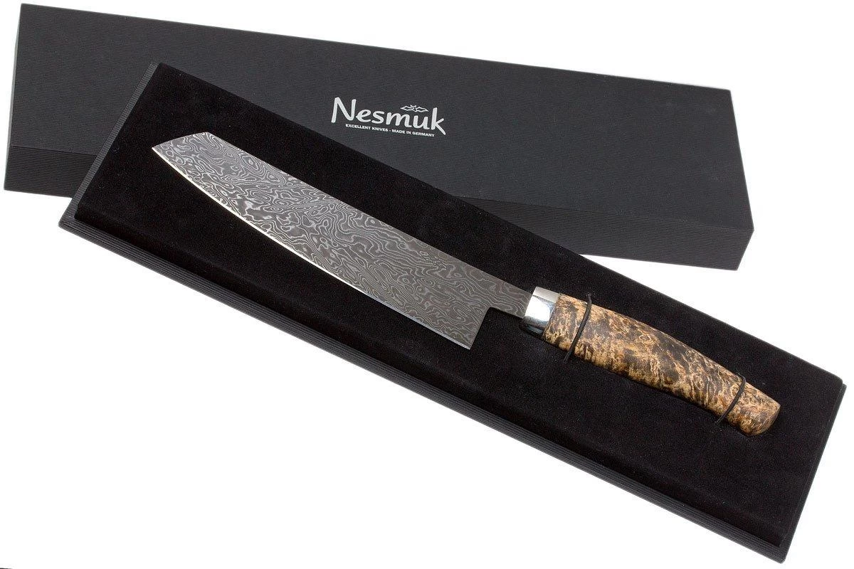 Le manche est fabriqué en bois venant de Finlande et de Russie appelé ‘karelian birch burl’’. Une essence de bois à la couleur blanche, brun rouge. La densité de ce bois est très haute : 700kg/m3. Ce type de bois est souvent utilisé pour la fabrication de couteaux scandinaves. Le manche est très ergonomique pour travailler sans fatiguer.