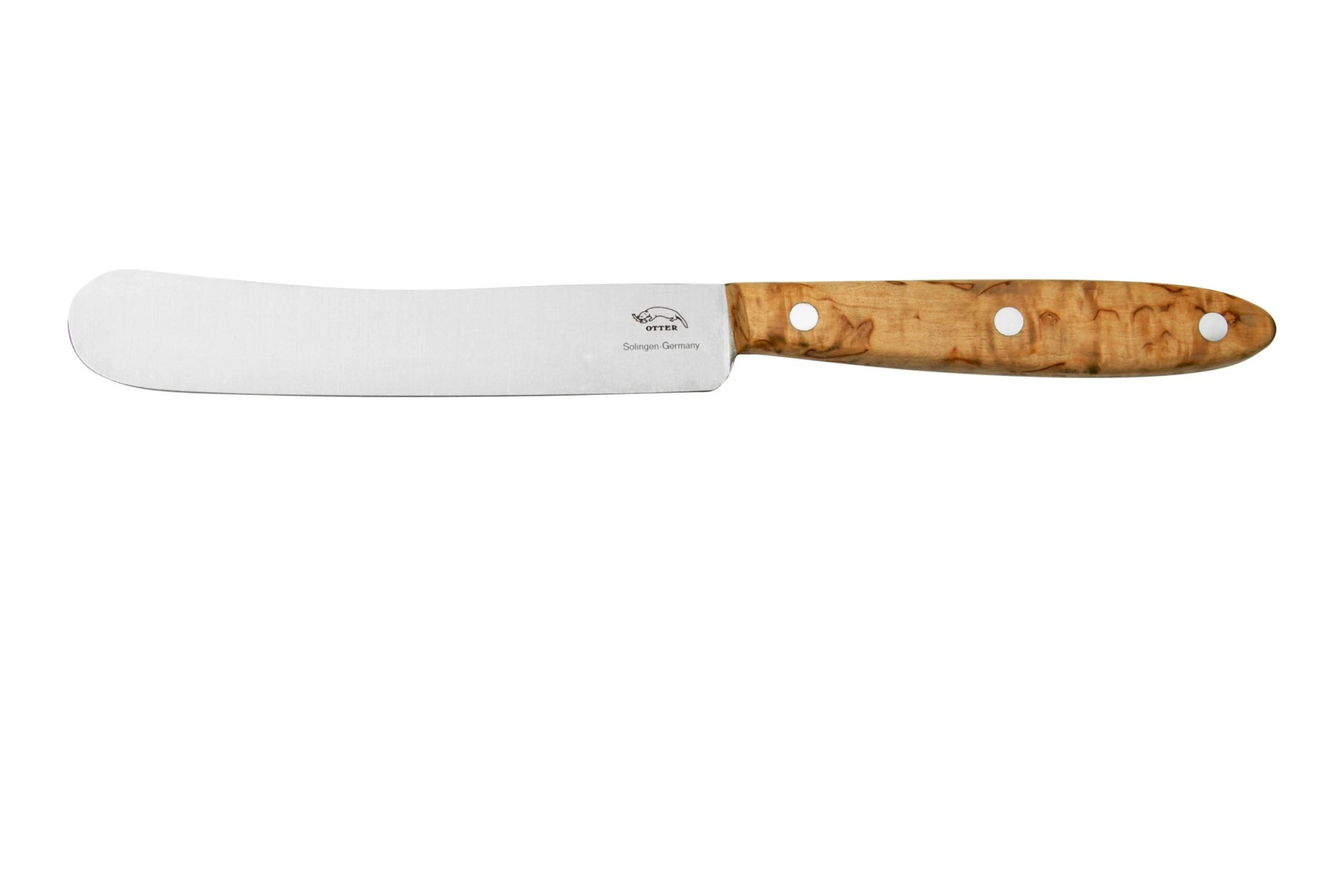 Le couteau de table Otter en Curly Birch est parfait pour beurrer vos tartines le matin. L’extrémité arrondie de la lame est idéale pour tartiner facilement. La lame de 12,5 cm de long est parfaite pour racler le fond des pots de pâte à tartiner. Ce couteau est très tranchant et permet aussi de couper du saucisson, du fromage ou des petits pains.