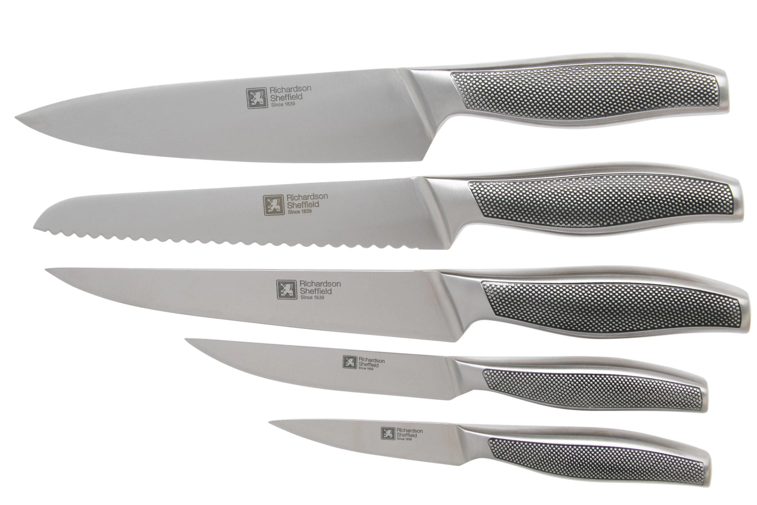 Ce set de 5 couteaux avec bloc Richardson Sheffield Sense a une forme arrondie unique et offre un look brut et moderne à votre cuisine. Ce set contient tous les couteaux dont vous avez besoin pour cuisiner. Il est doté de pieds doux, pour ne pas rayer votre plan de travail.