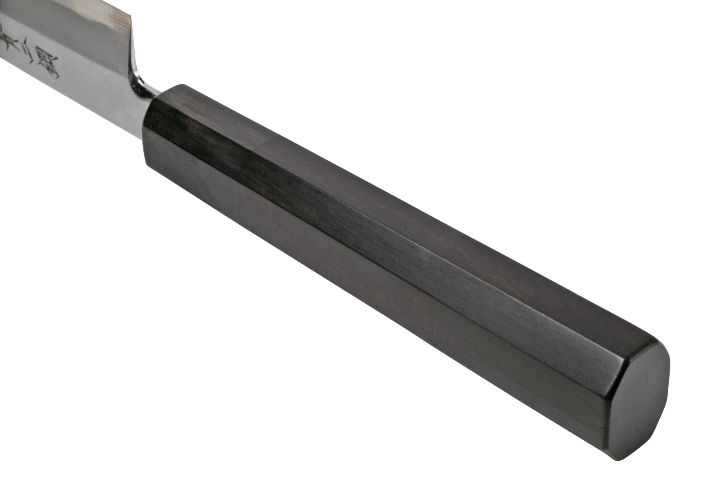 Le fuguhiki Sakai Takayuki Blue 2 Steel Japanese Style 01214 est un couteau de cuisine japonais, conçu à l’origine pour couper du fugu. Il s’agit d’un plat asiatique composé de poisson-globe, très toxique. Les filets de ce poisson doivent être levés de façon extrêmement précise, afin de retirer les parties toxiques du poisson, sans contaminer le reste. Les chefs doivent suivre une formation spéciale avant d’avoir le droit de préparer ce plat. Et, bien entendu, ils doivent être équipés pour cela d’un fuguhiki très très fin !