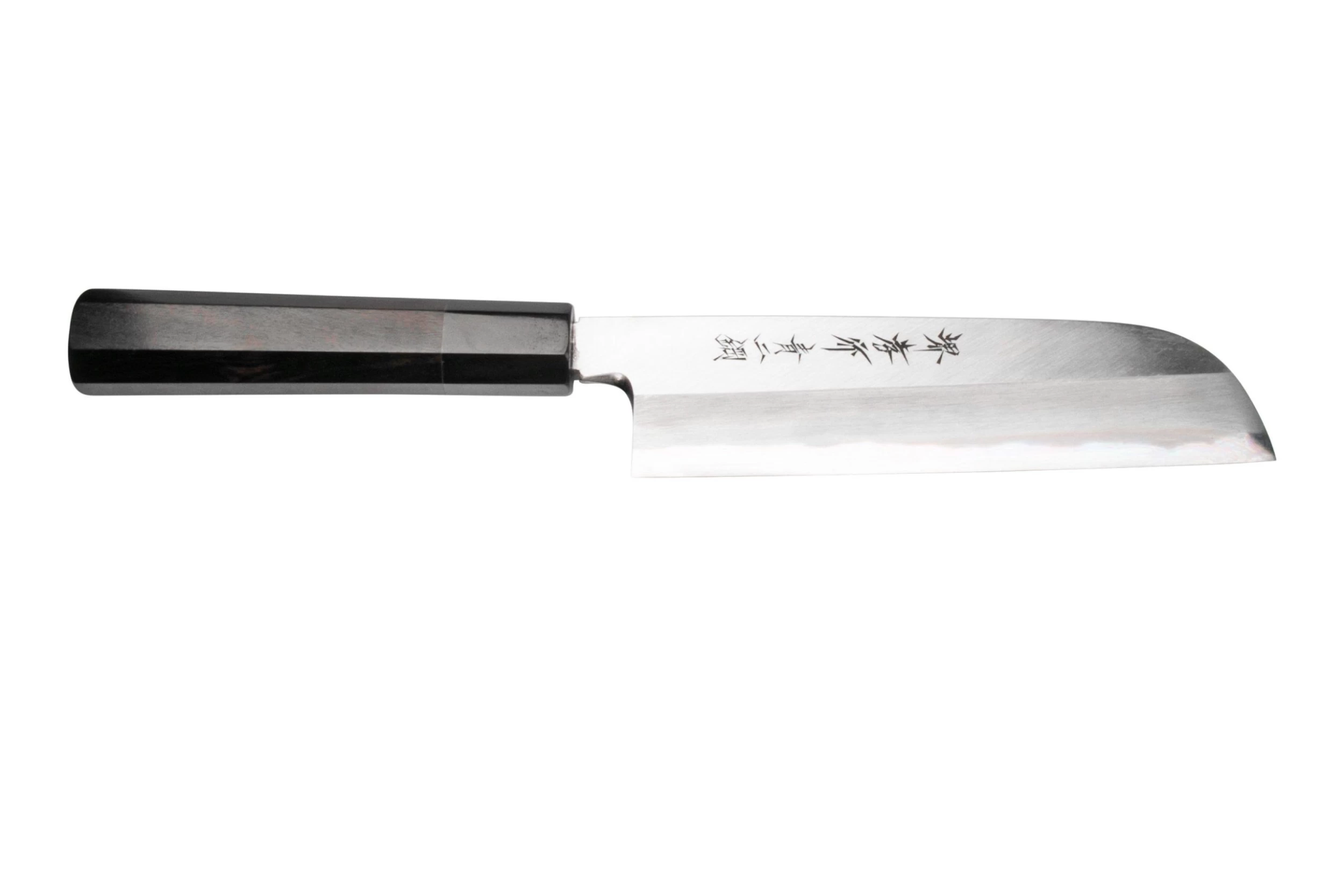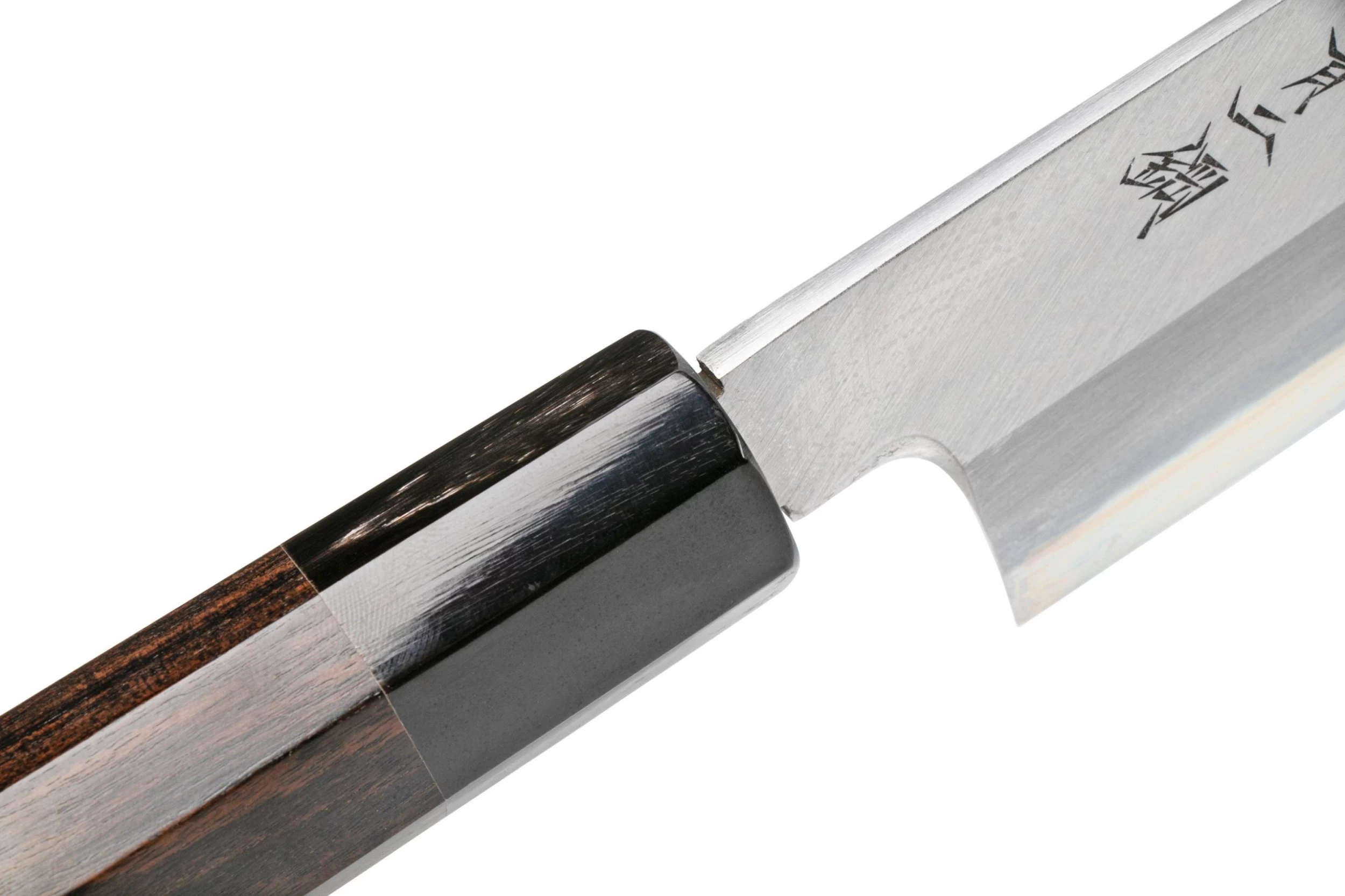 Le kamagata usuba Sakai Takayuki Blue 2 Steel Japanese Style 01253 est un couteau à légumes japonais élégant. Ce kamagata usuba a une forme de lame particulière, où le dos de la lame s’arrondi vers la pointe. On dirait donc un mélange entre un santoku et un nakiri. Nous ne pouvons pas expliquer cet arrondi, mais ce couteau est parfait pour couper de fines tranches de viande, de poisson et de légumes.