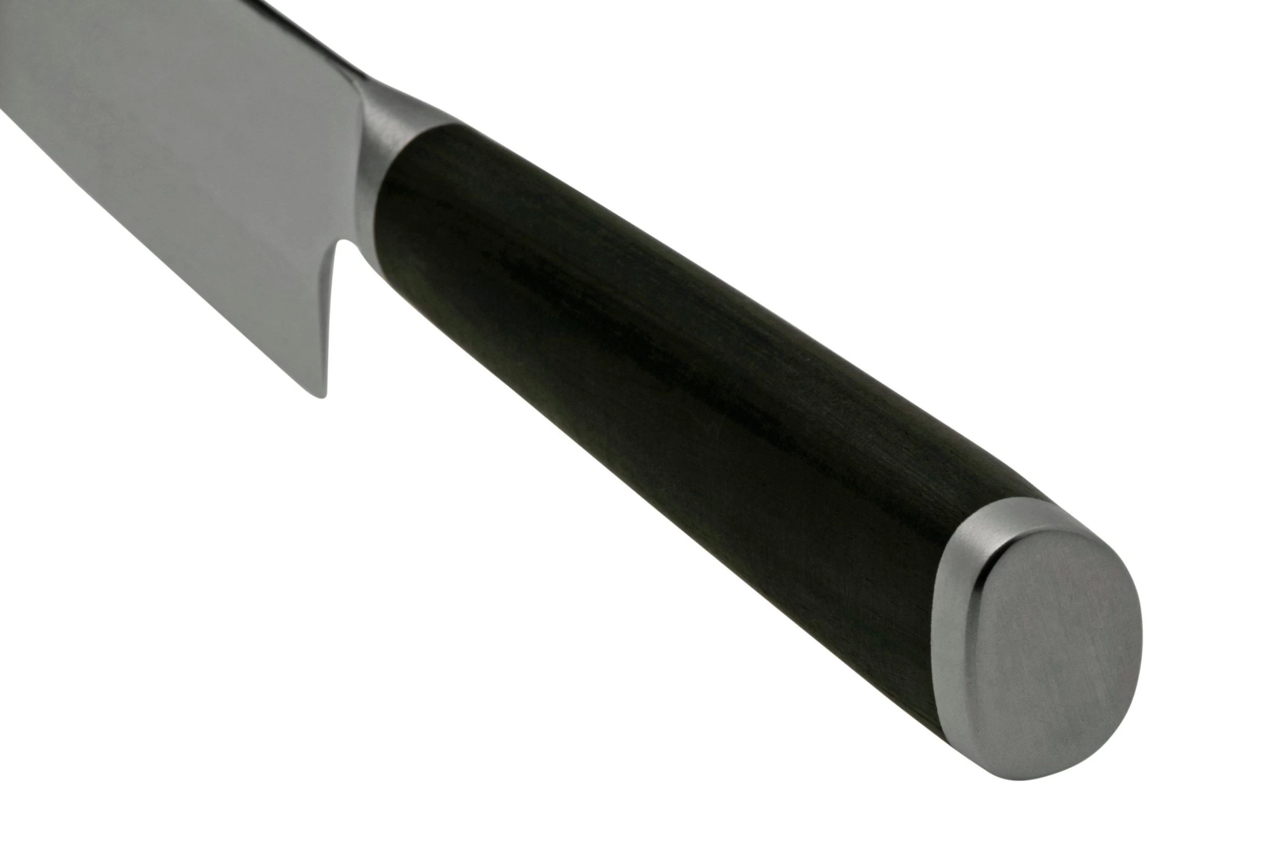 Le gyuto 18 cm Shizu Hamono Shikisai Miyako Bessaku est la plus petite version de ce couteau de cuisine japonais polyvalent. Gyuto signifie « épée à bœuf » en japonais. Un peu lugubre, mais cela veut dire que ce couteau a été conçu à la base pour préparer la viande. De nos jours, un couteau Gyuto est un couteau de chef polyvalent pour couper de la viande, du poisson, des légumes et bien d’autres ingrédients !
