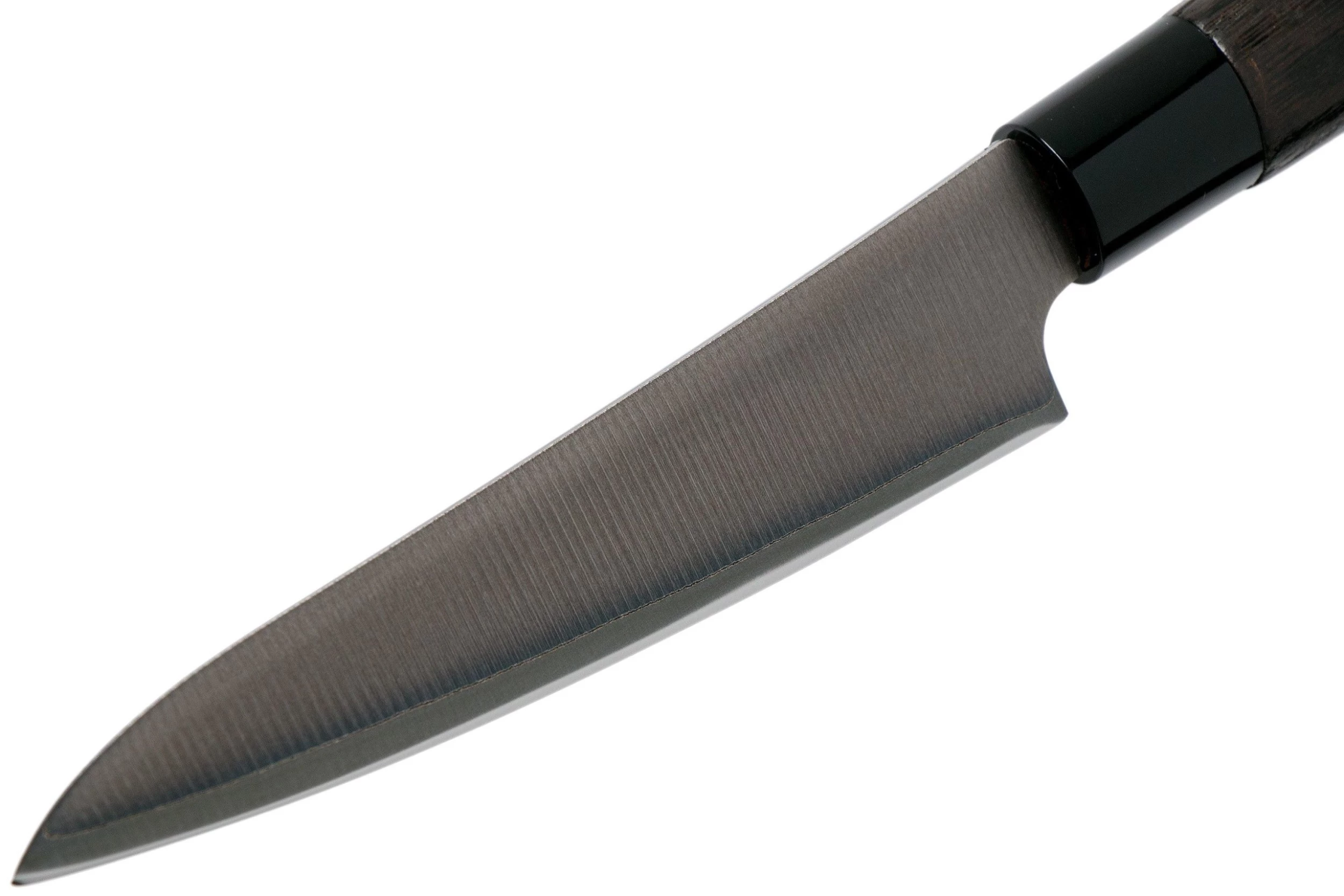 Le couteau Petty Tojiro Zen Black est l’équivalent japonais du couteau d’office. Un peu plus grand, mais toujours aussi doué pour faire le job. On peut l’utiliser pour éplucher, couper et trancher les fruits et légumes. Parfait aussi quand on a besoin d’une lame un peu plus grande.