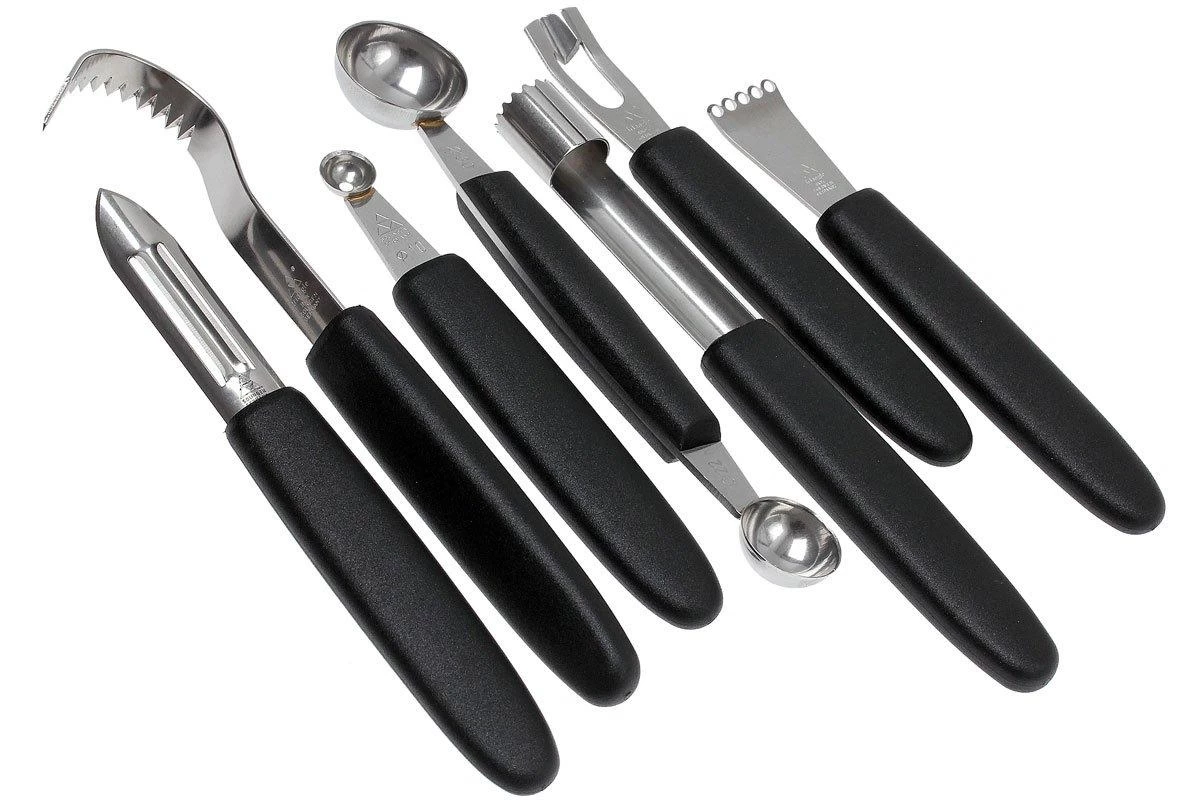 Cet avantageux set à garnir Triangle se compose de 7 éléments pour préparer un beau festin. Le set contient un éplucheur, un couteau à beurre décoratif (pour ondulations), deux cuillères à pommes parisienne (3 tailles : 10 mm, 22 mm et 30 mm), un vide-pomme, un couteau de canal et un zesteur. Tous ces outils sont en inox avec un manche en plastique.