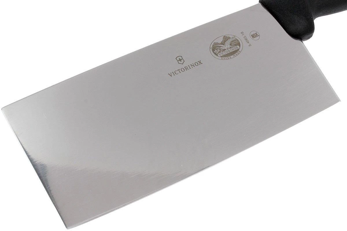 La forme de ce couteau de chef chinois Victorinox Fibrox ressemble à celle d’un couperet. Mais ne vous trompez pas, ce n’est absolument pas fait pour hacher ! La lame d’un couperet est robuste et épaisse alors que celle d’un couteau de chef Chinois est très fine et tranchante comme un rasoir. Elle est donc fragile et conçue uniquement pour couper les légumes et herbes aromatiques très finement mais aussi pour écraser les gousses d’ail par exemple. Elle se brise si on l’utilise sur des os ou des aliments très durs.