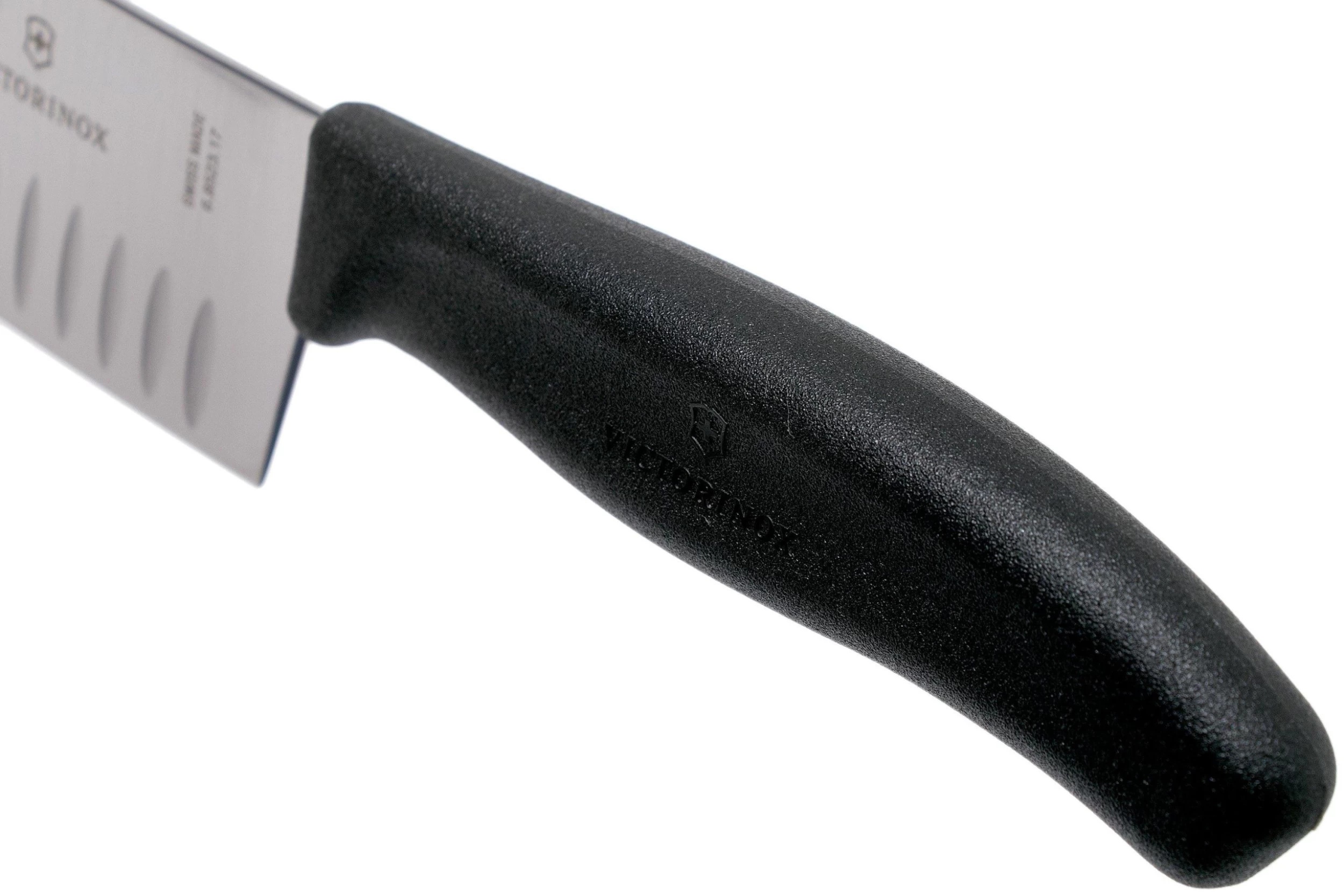 Le Santoku à alvéoles Victorinox SwissClassic, noir, est idéal pour couper la viande, les légumes et le poisson. Un Santoku est à l’origine un couteau de chef japonais, et il est aujourd’hui présent dans toutes les cuisines ! Des alvéoles au niveau de la lame empêchent les aliments de coller. La large lame de ce couteau Santoku est parfaite pour faire glisser les ingrédients dans une poêle par exemple.