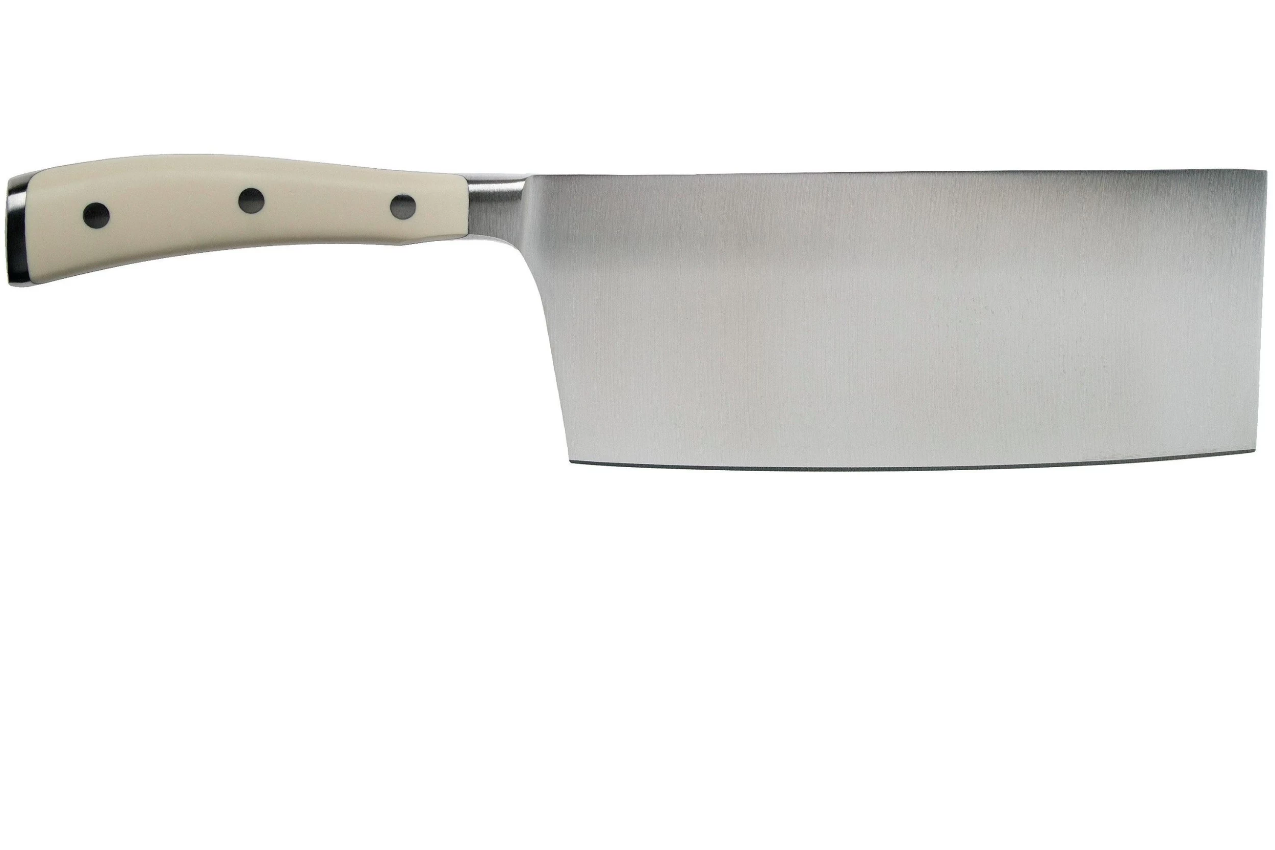 Le couteau de chef chinois Wüsthof Classic Ikon crème 18 cm ressemble à un couperet chinois mais il ne faut surtout pas se méprendre ! Sa lame est aiguisée de façon beaucoup plus fine que celle d’un couperet et elle ne convient que pour trancher les légumes et fines herbes. La hauteur de la lame permet de guider facilement le couteau avec les doigts lors du tranchage des légumes et fines herbes puis de récupérer les ingrédients tranchés pour les transvaser. Le manche de ce couteau est de couleur crème.