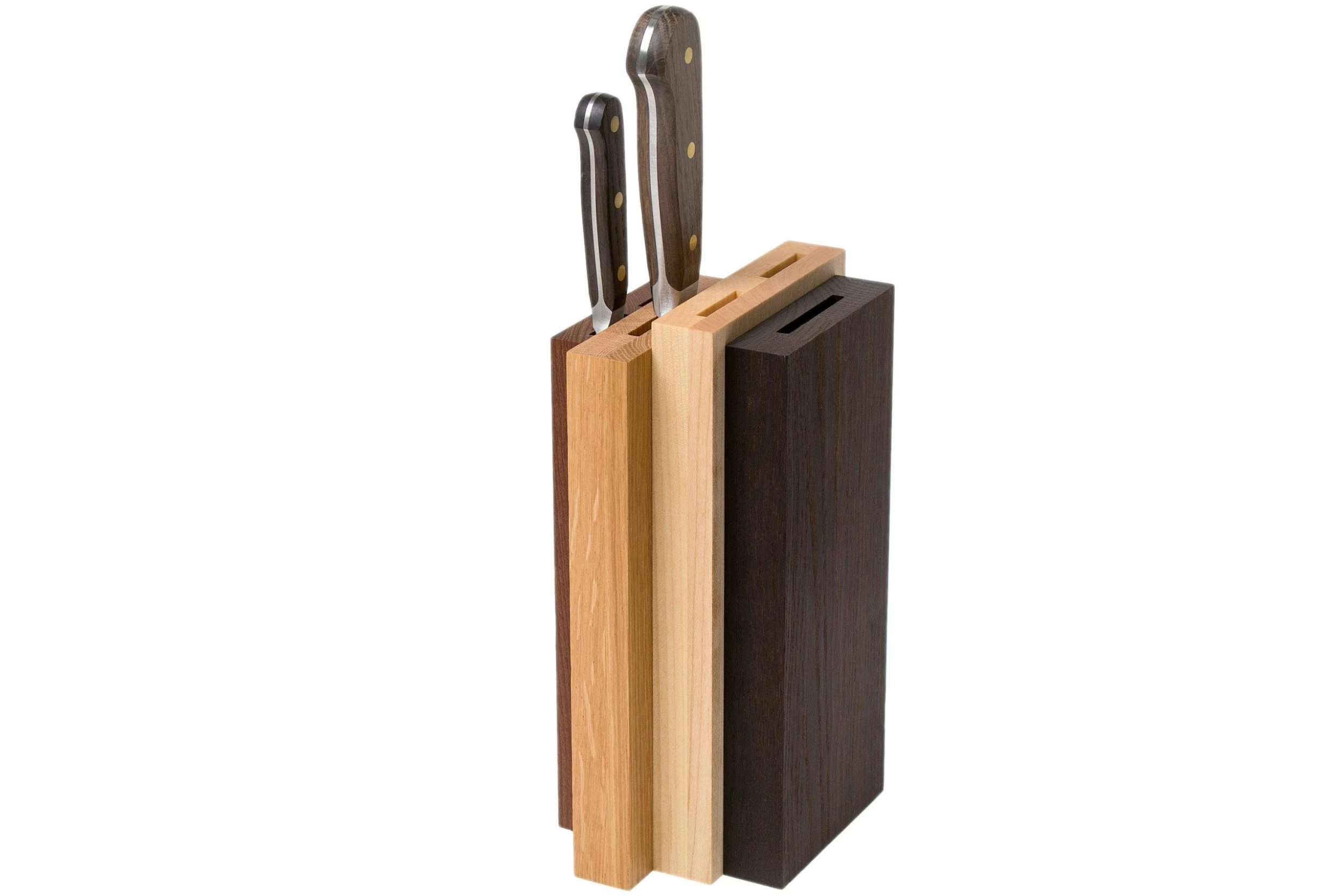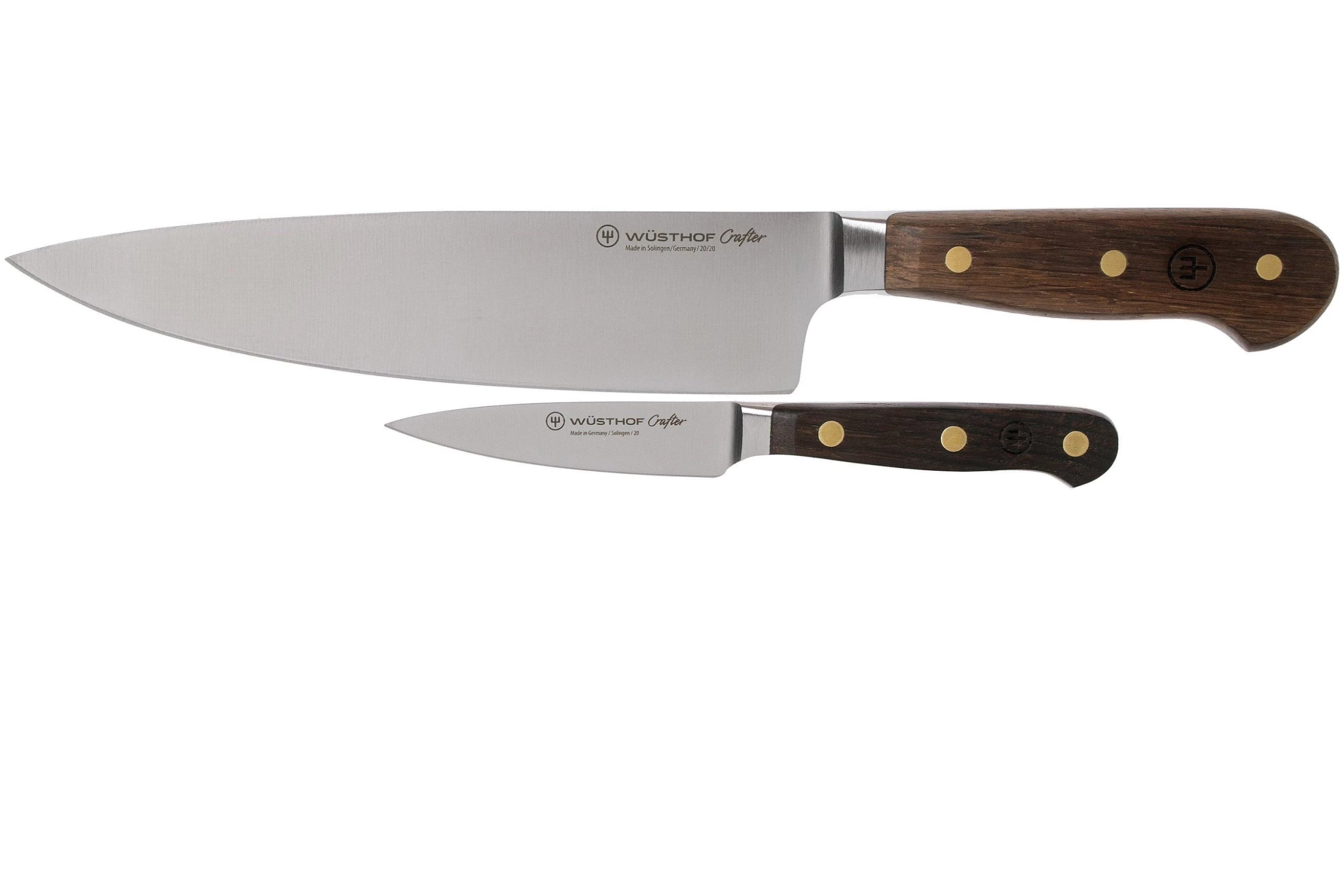 Les couteaux Wüsthof Crafter portent bien leur nom. De vrais couteaux de travail incroyablement robustes. Le manche est en chêne fumé et donc résistant à l’eau. Il est préférable de nettoyer les couteaux à la main plutôt qu’au lave-vaisselle. Cela ne fait aucun bien ni à la couleur du bois, ni au tranchant de la lame. Le manche a une très bonne prise en main et la mitre étendue protège très bien les doigts. Cette mitre pleine apporte un équilibre parfait, idéal pour cuisiner. Des rivets rustiques en laiton fixent le manche en bois à la soie du couteau.