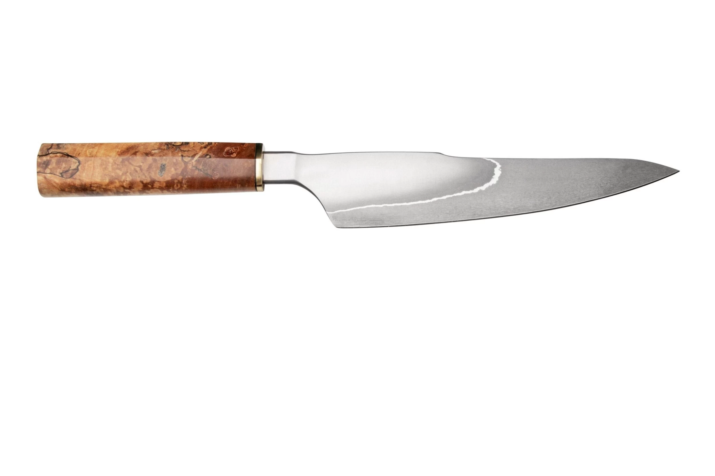 Le couteau de chef San Mai Xin Cutlery XinCraft XC135 est un couteau de cuisine japonais très esthétique. La méthode de forge utilisée est très particulière ; associée à un matériau de manche luxueux, on obtient alors un couteau de cuisine très esthétique, qui coupe très bien. Ce couteau de chef est idéal pour toutes les tâches de coupe en cuisine. De l’épluchage de légumes à la découpe d’un morceau de viande, en passant par coupe fine d’une gousse d’ail.