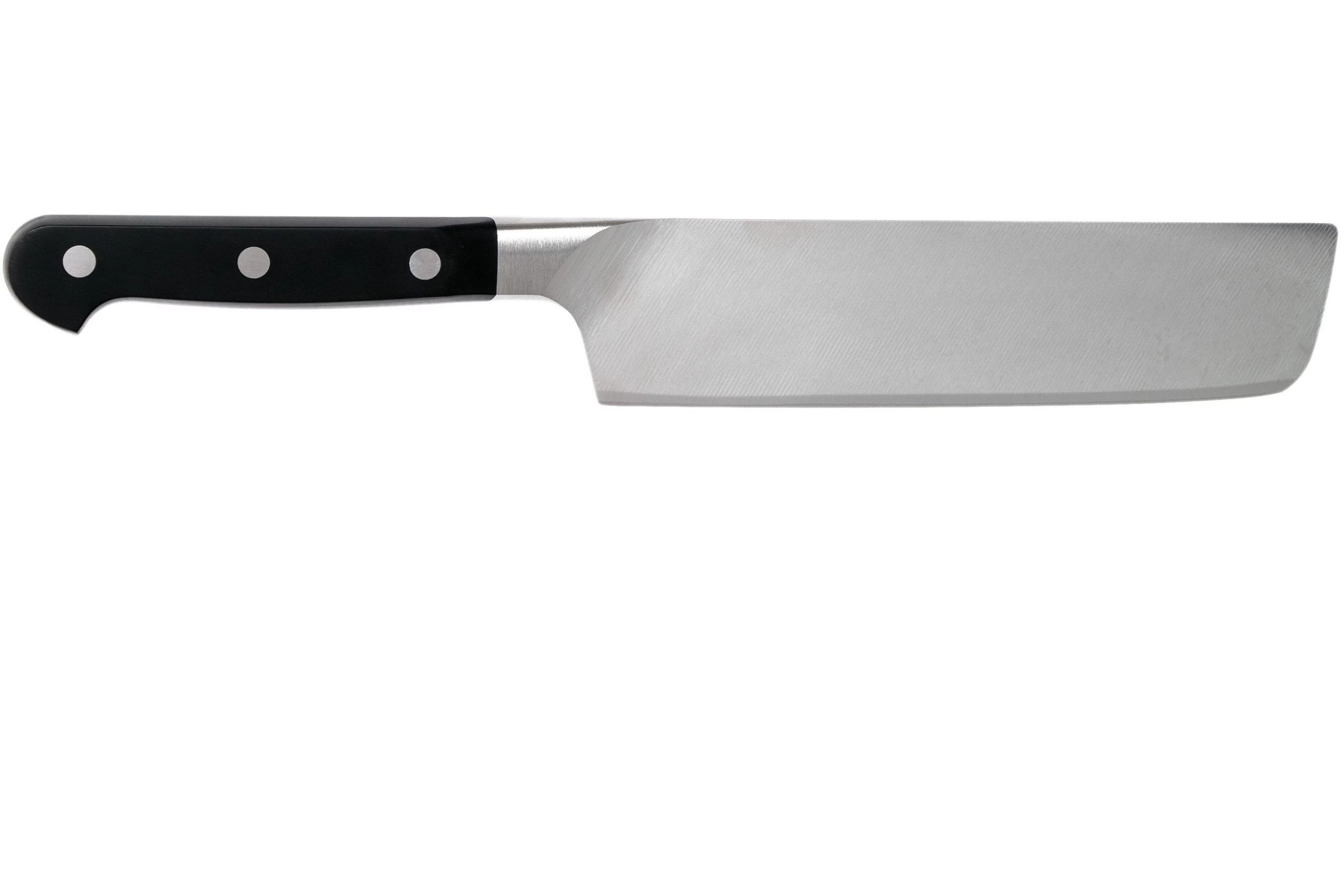 Ce Zwilling Pro Nakiri avec une lame de près de 17 cm est parfait pour la coupe très fine des légumes et fruits. Sa lame haute vous permet »d’empiler » les aliments contre celle-ci.
